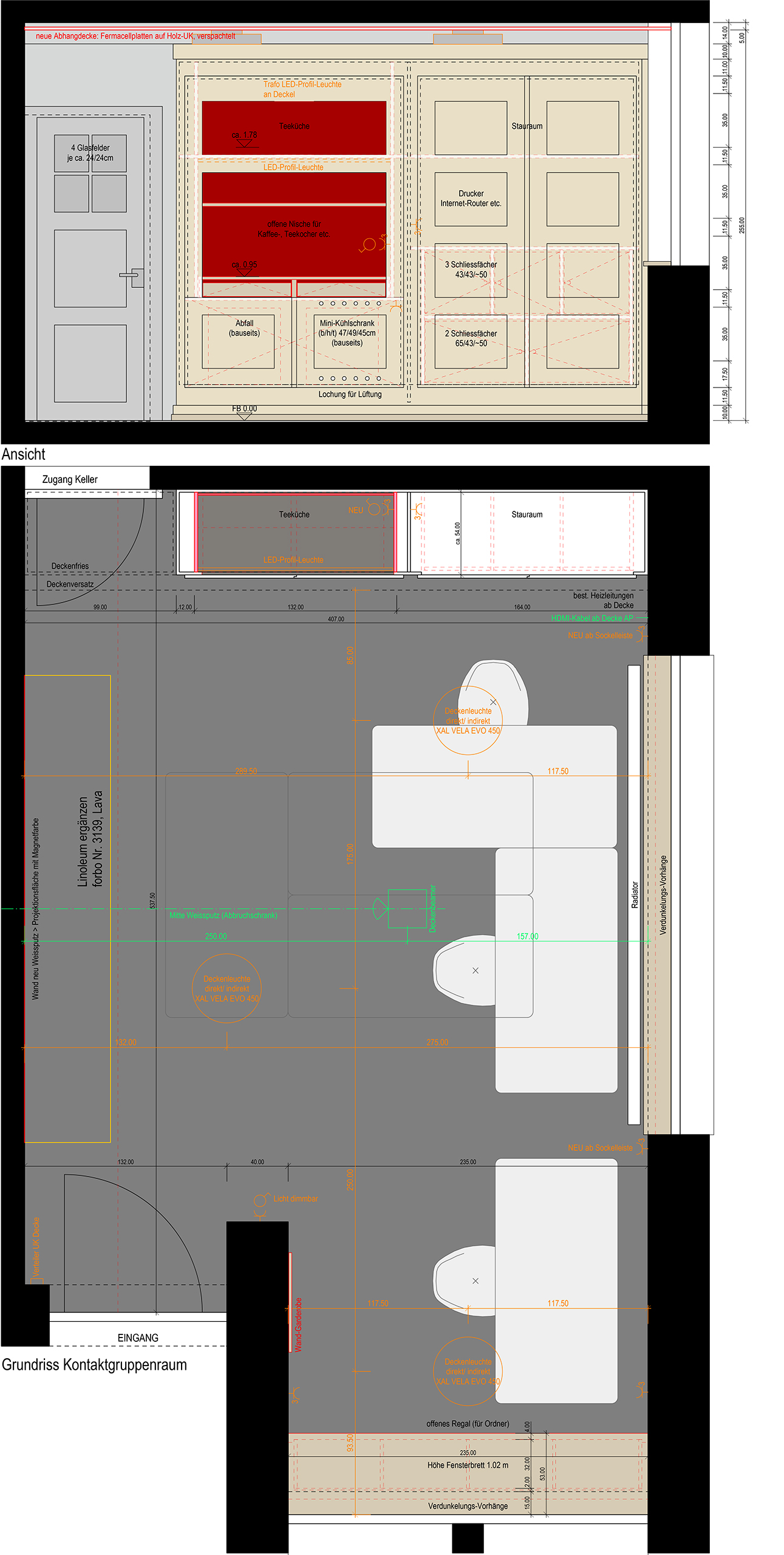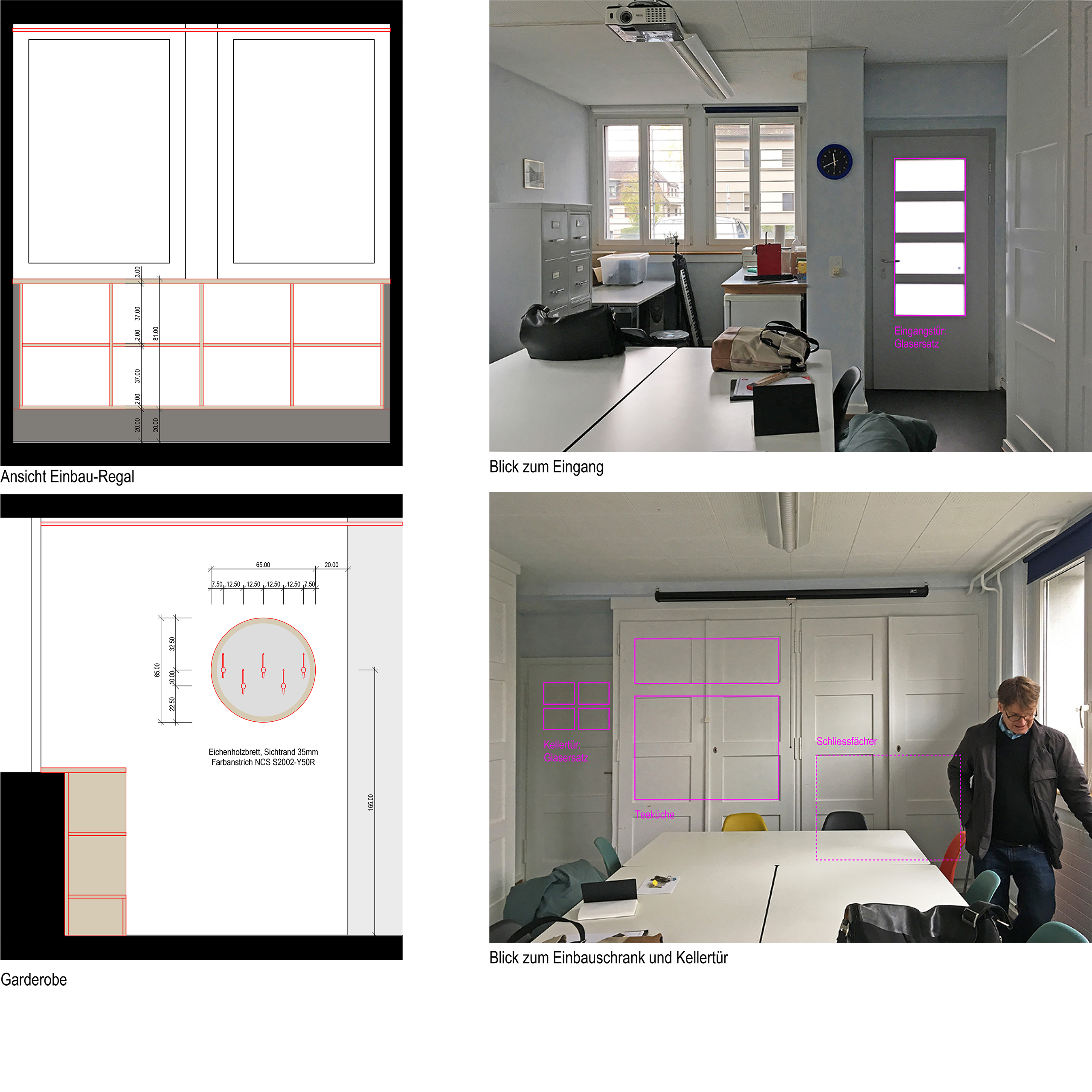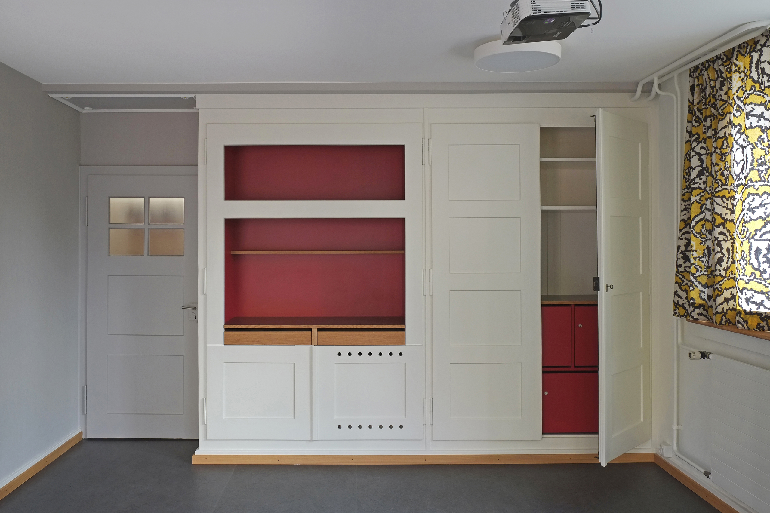 Mit kleinen Eingriffen und einer Auffrischung der Oberflächen wird in dem vorher wenig genutzten Raum eine freundliche Atmosphäre geschaffen. Der Einbau von zusätzlichem Stauraum und der Teeküche ermöglichen die Nutzung des Arbeitsraums durch verschiedene Gruppen und auch Einzelpersonen.