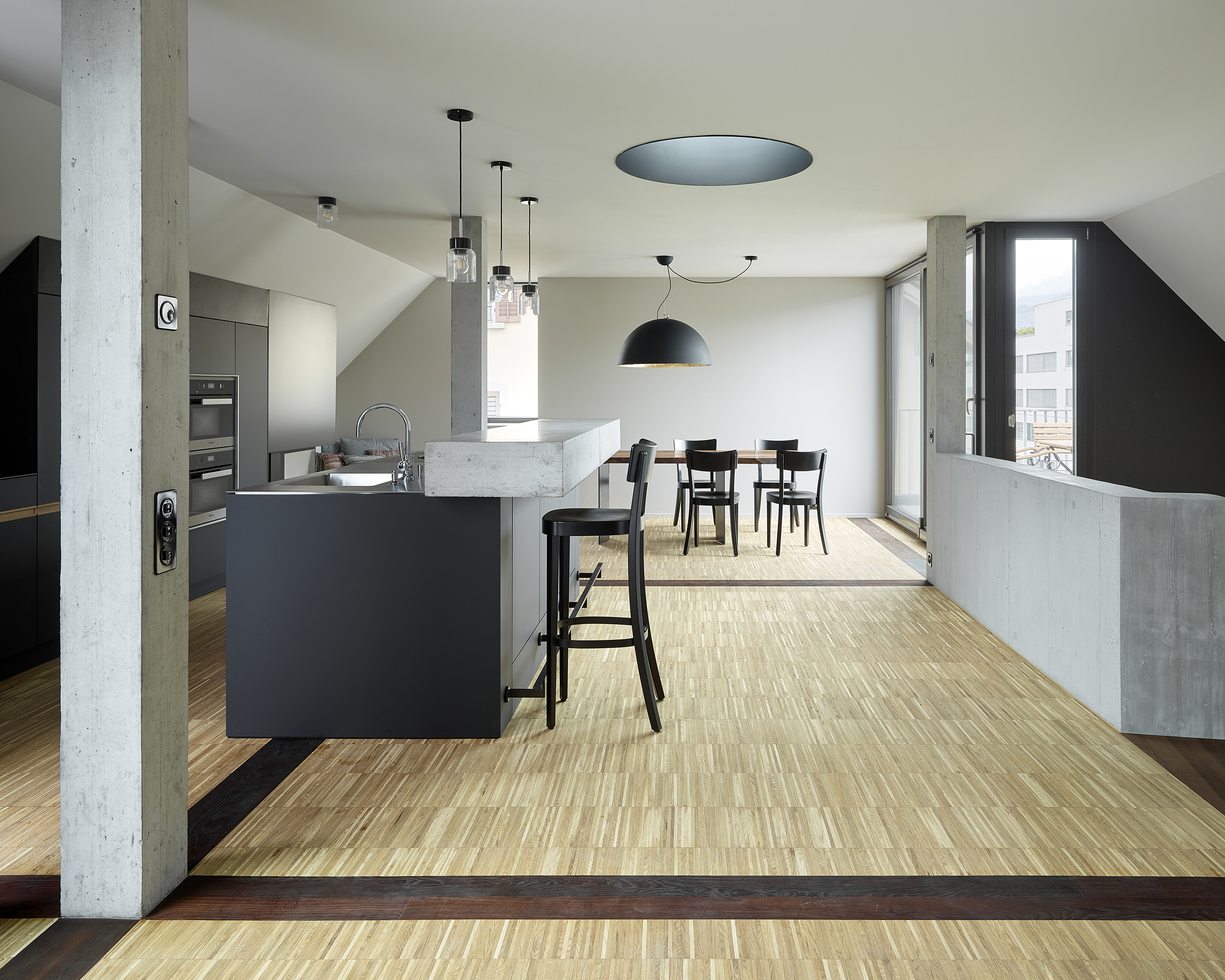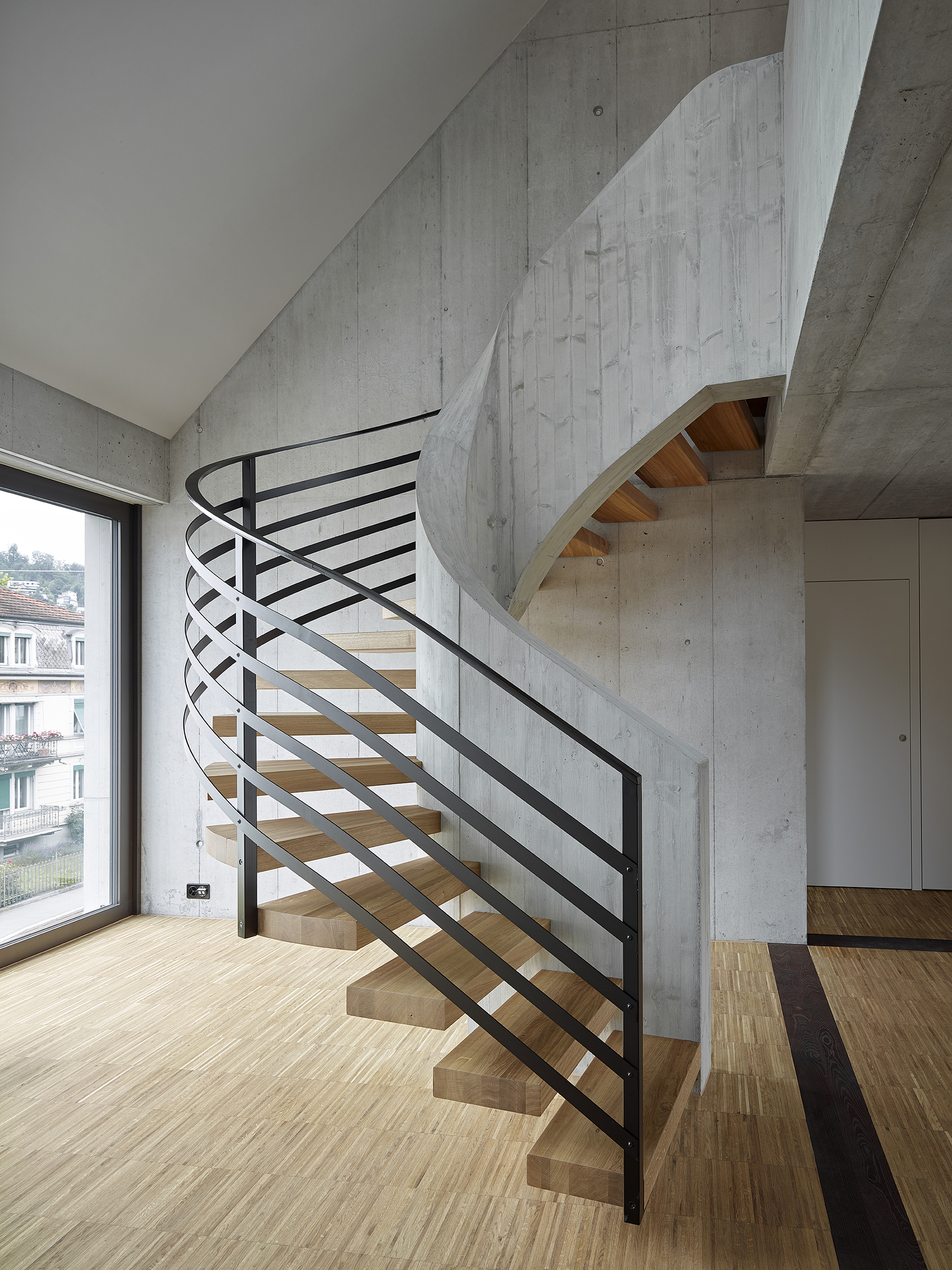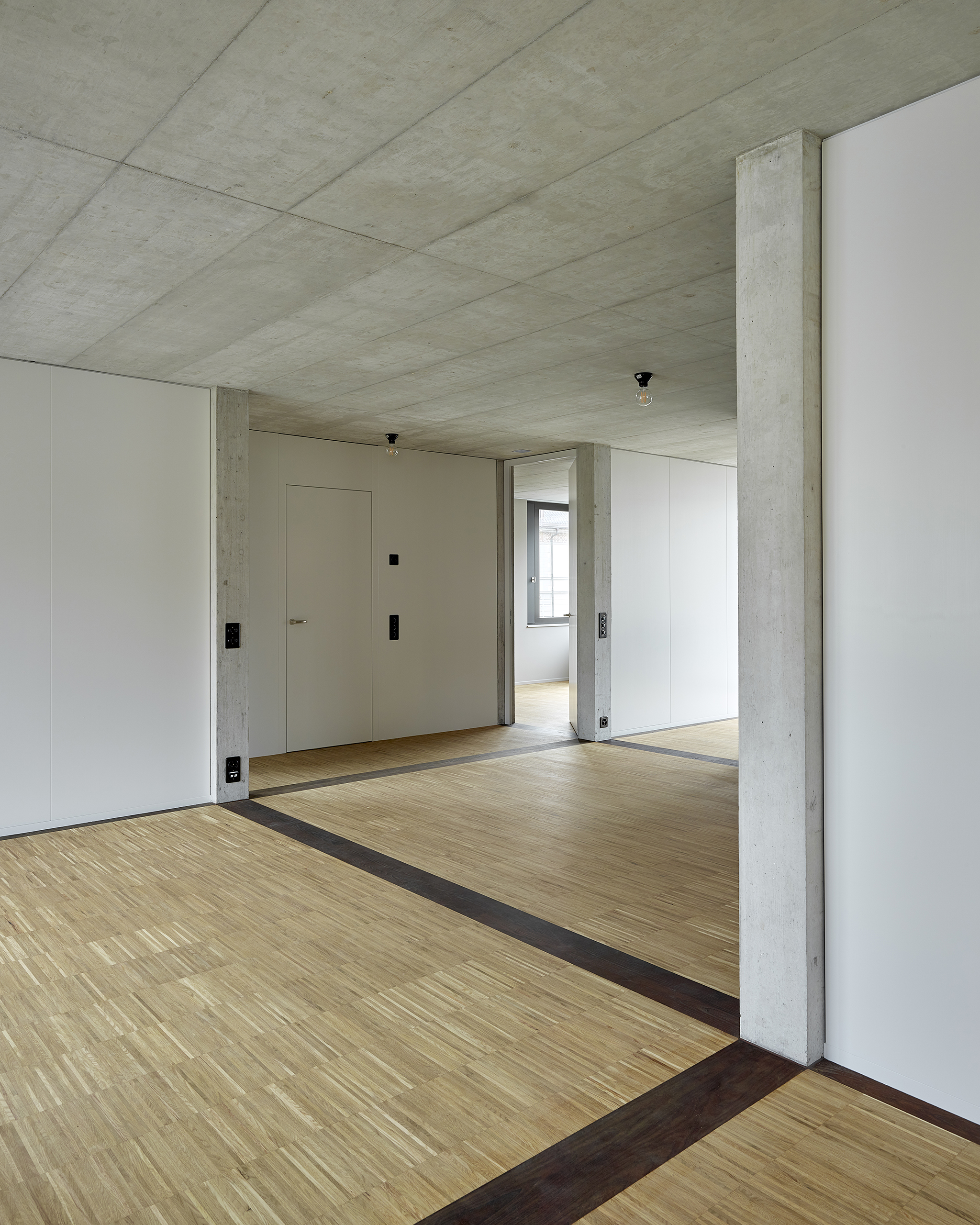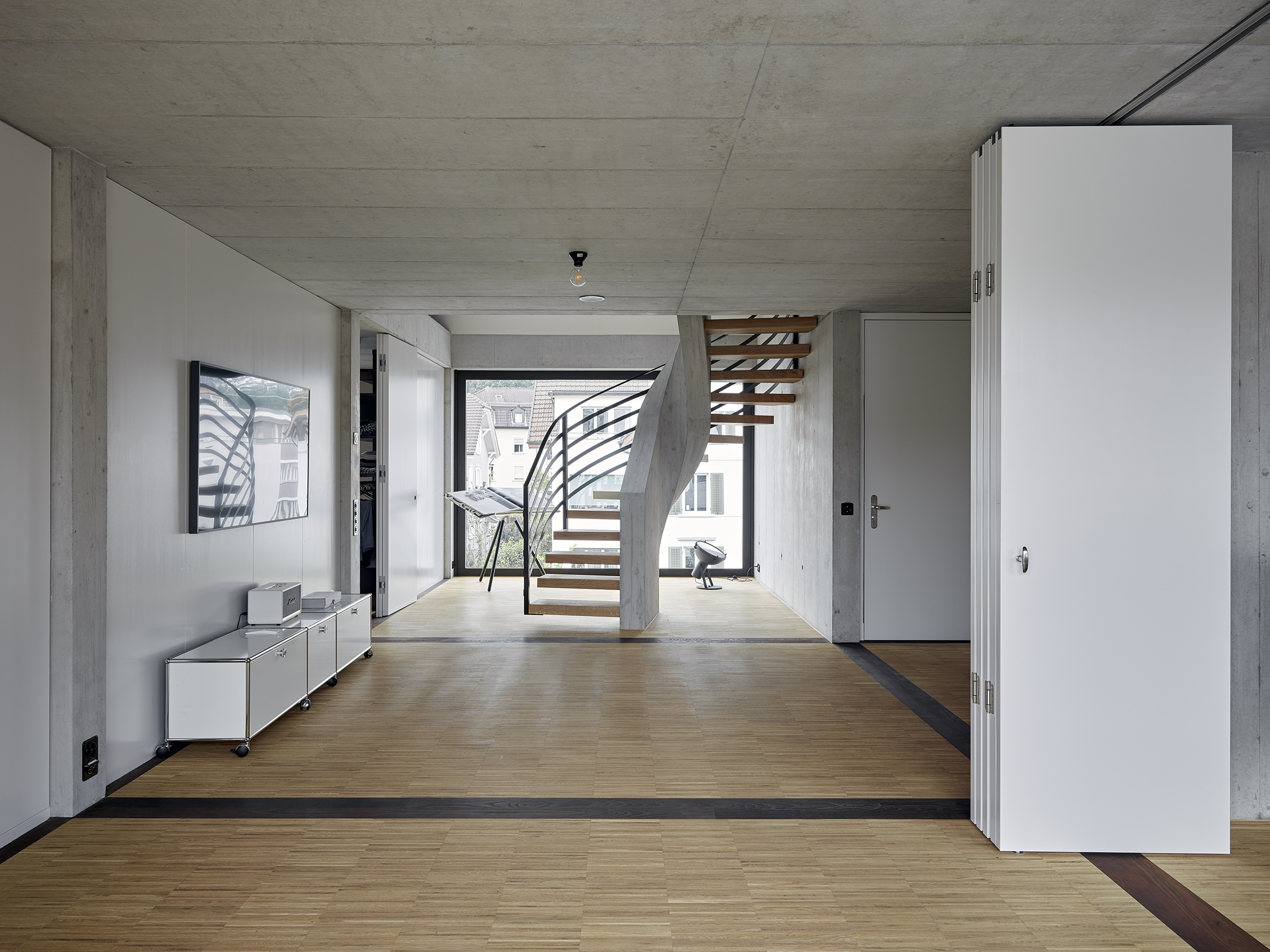 Der Grundriss ist in neun praktisch gleich grosse Einheiten gegliedert. Eine davon belegt das grosszügige allgemeine Treppenhaus, zwei die Kerne mit Nasszellen und eine Einheit beherbergt jeweils die Küche. Die restlichen fünf Räume sind beliebig nutzbar. Je nach Bedürfnis lässt sich der Grundriss von einer offenen Loft zur klassischen Wohnung mit vier abschliessbaren Zimmern transformieren.
