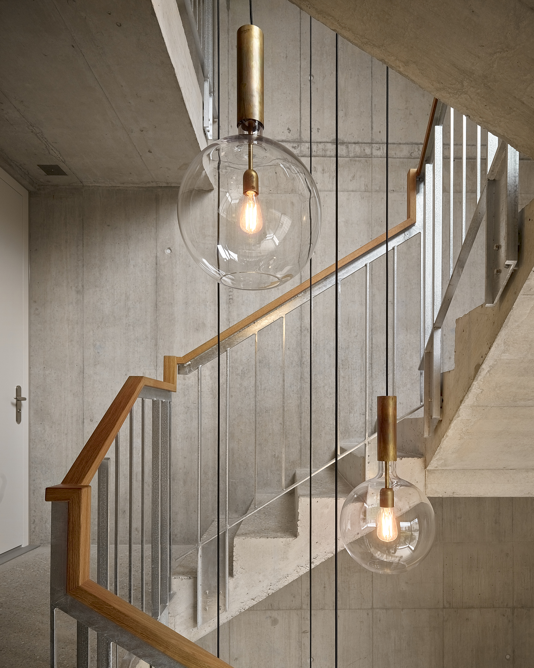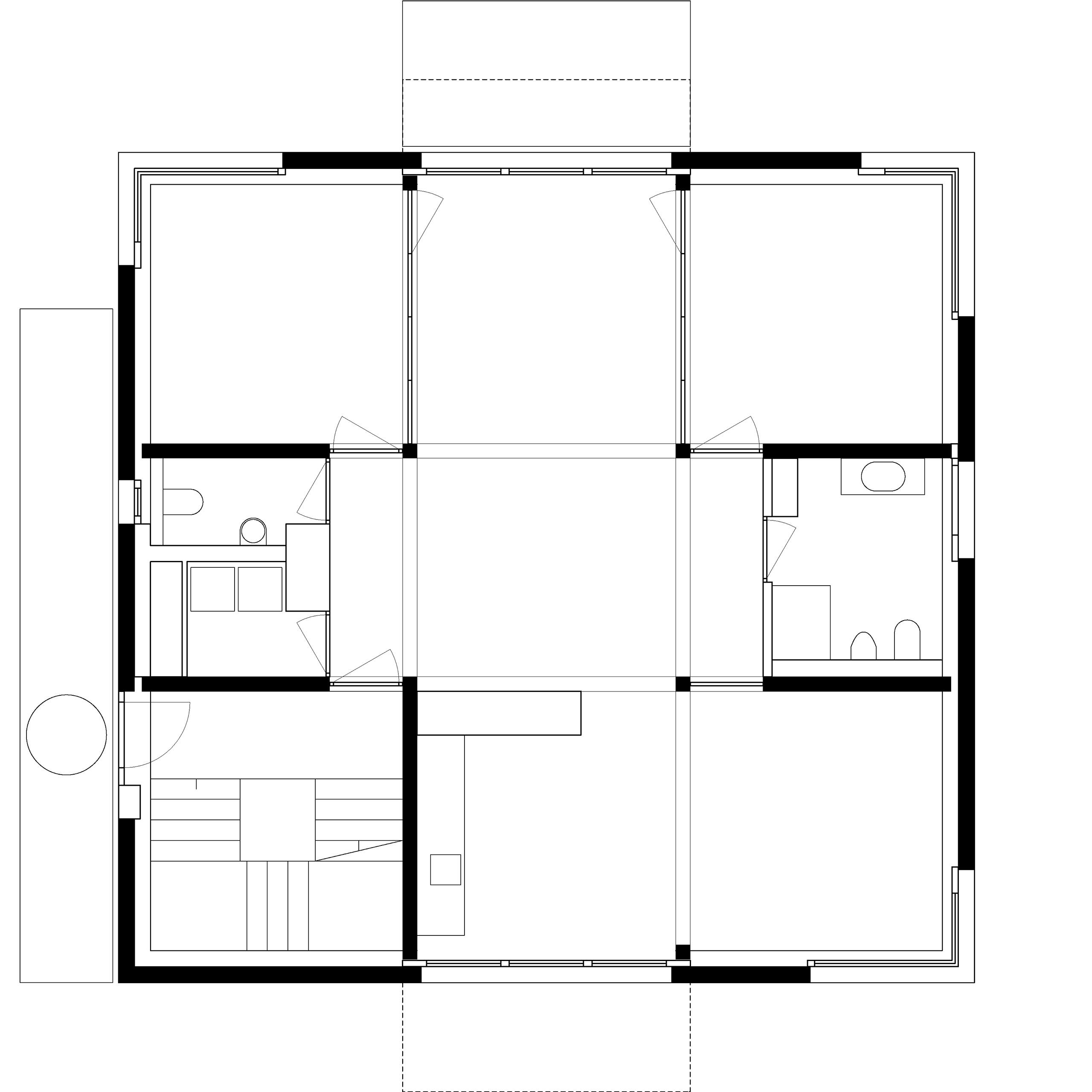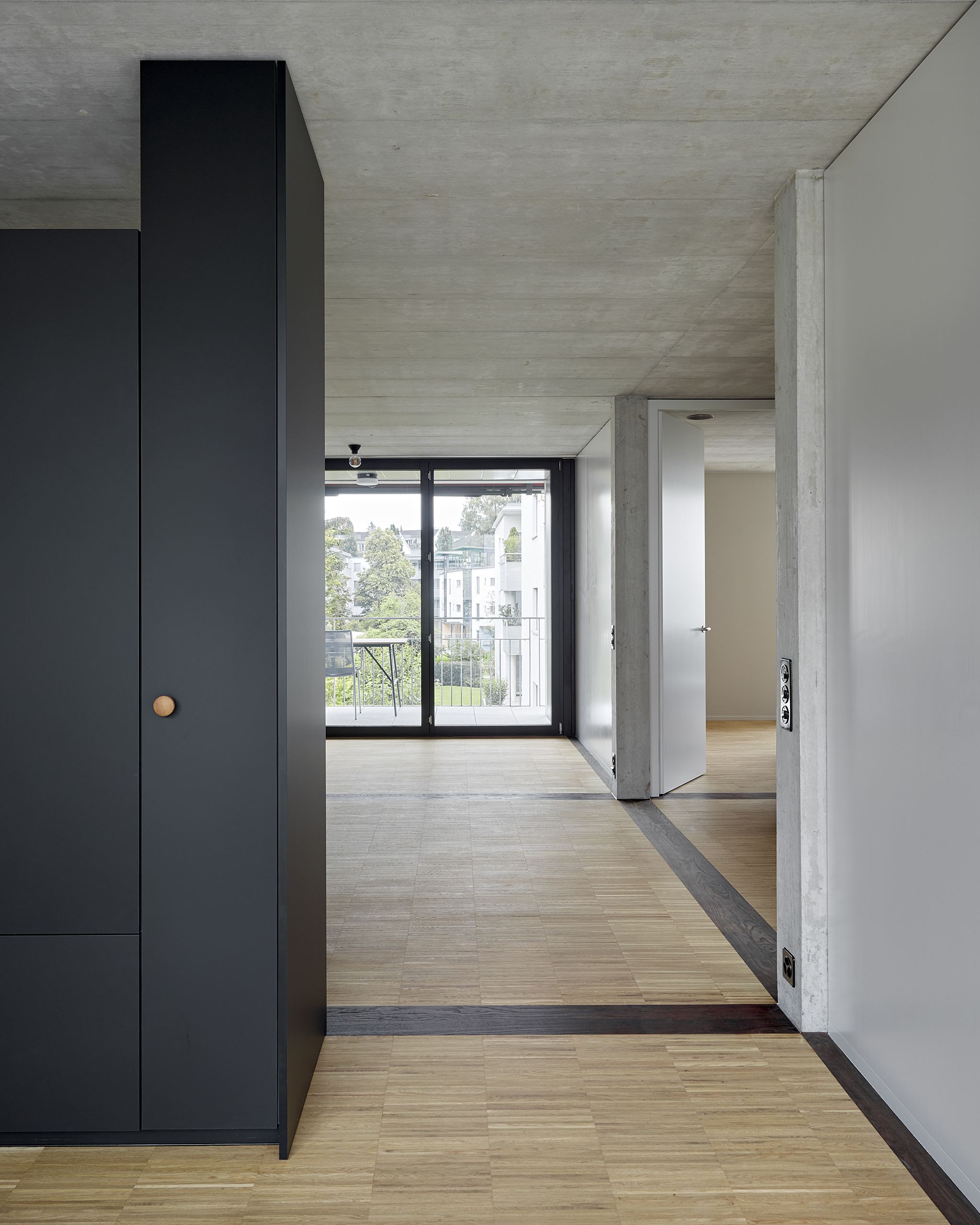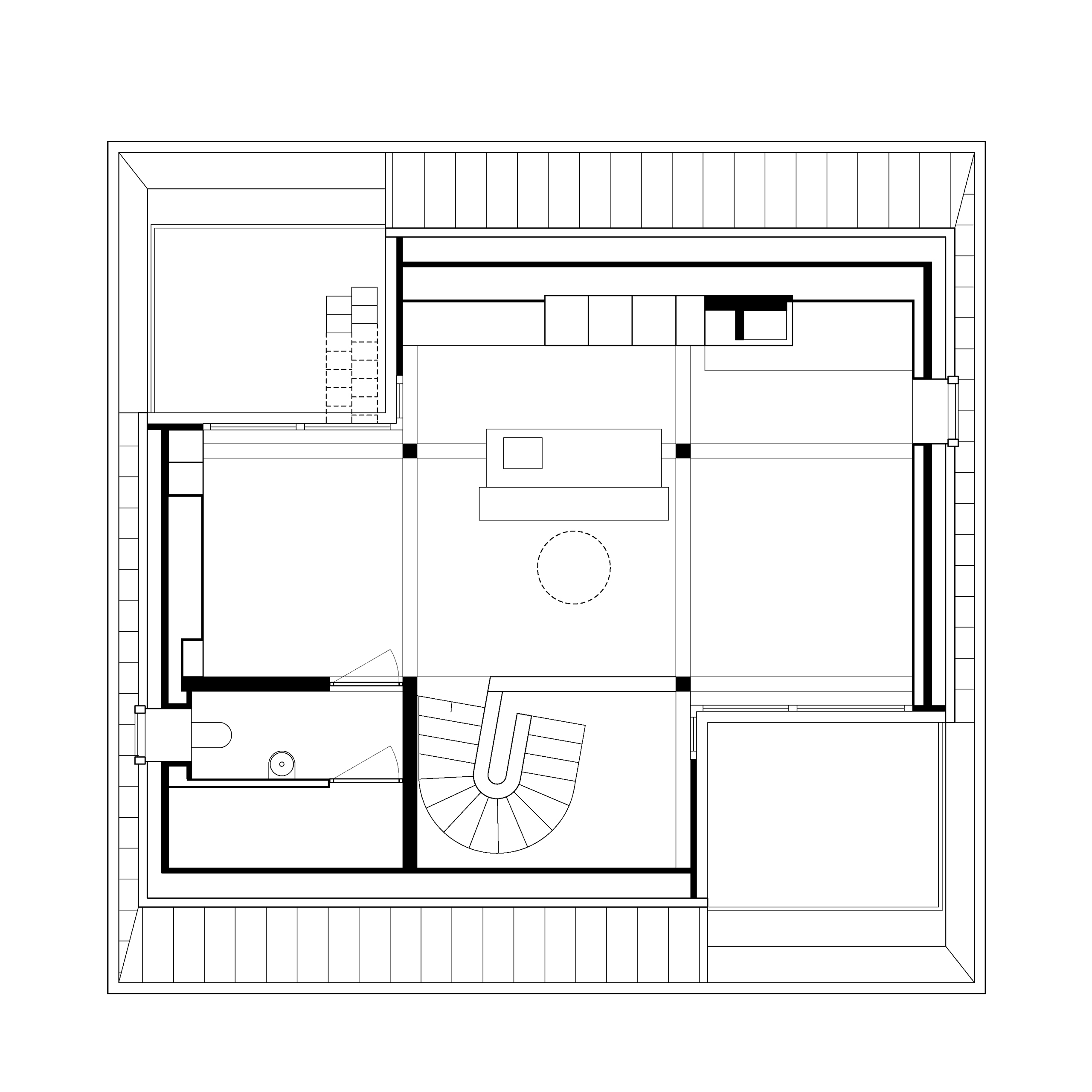 Der Grundriss ist in neun praktisch gleich grosse Einheiten gegliedert. Eine davon belegt das grosszügige allgemeine Treppenhaus, zwei die Kerne mit Nasszellen und eine Einheit beherbergt jeweils die Küche. Die restlichen fünf Räume sind beliebig nutzbar. Je nach Bedürfnis lässt sich der Grundriss von einer offenen Loft zur klassischen Wohnung mit vier abschliessbaren Zimmern transformieren.
