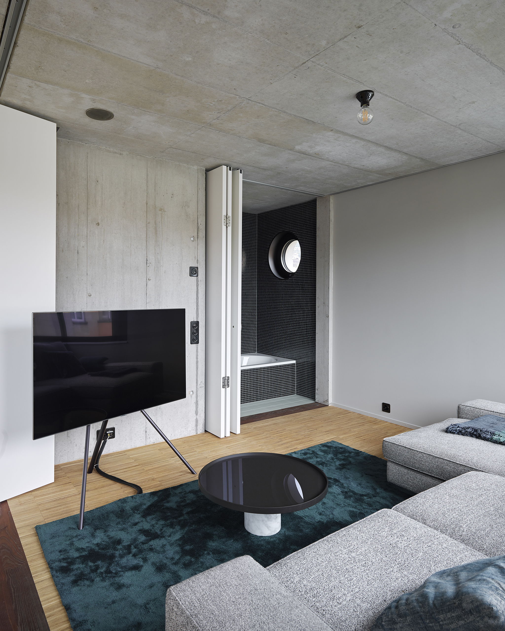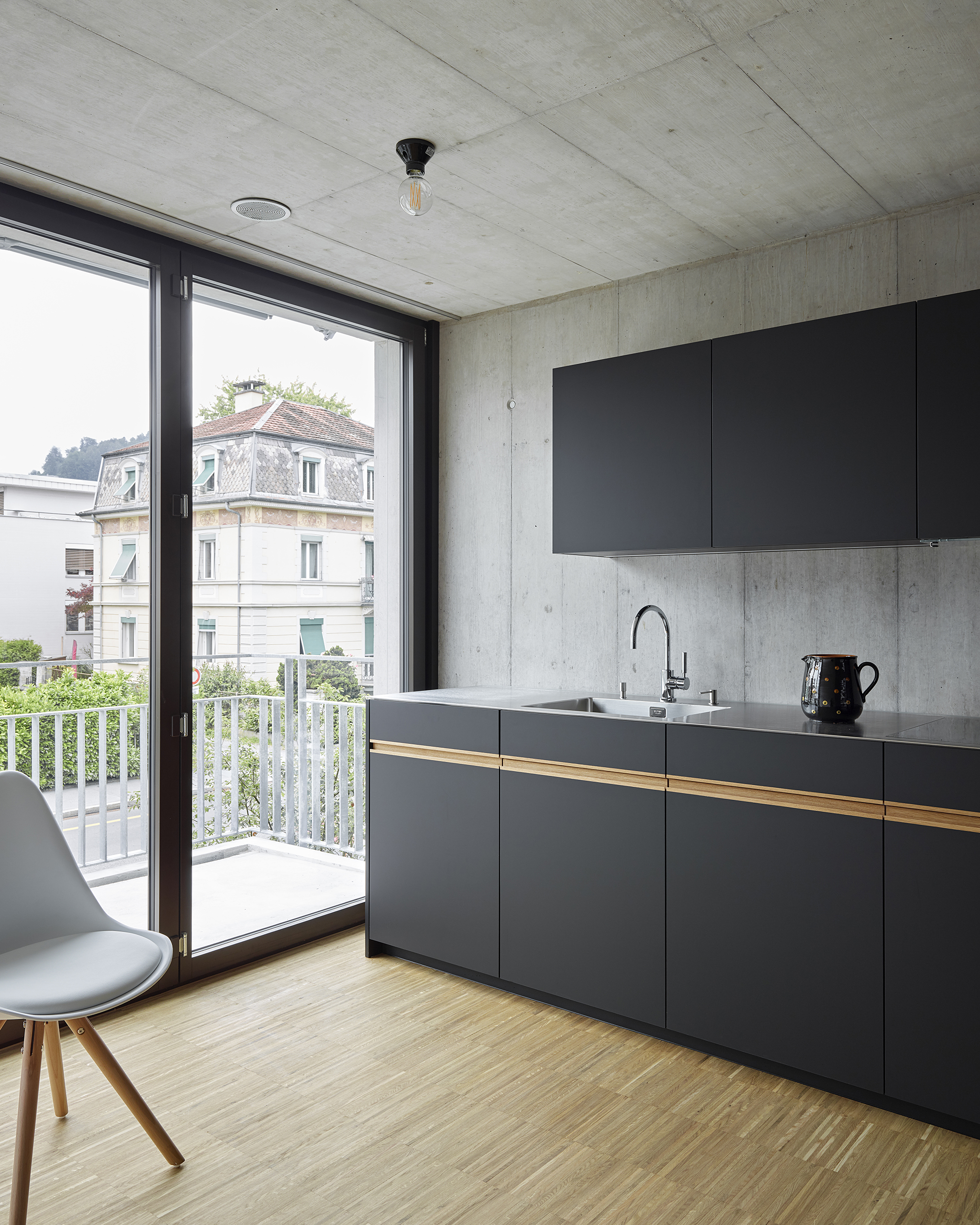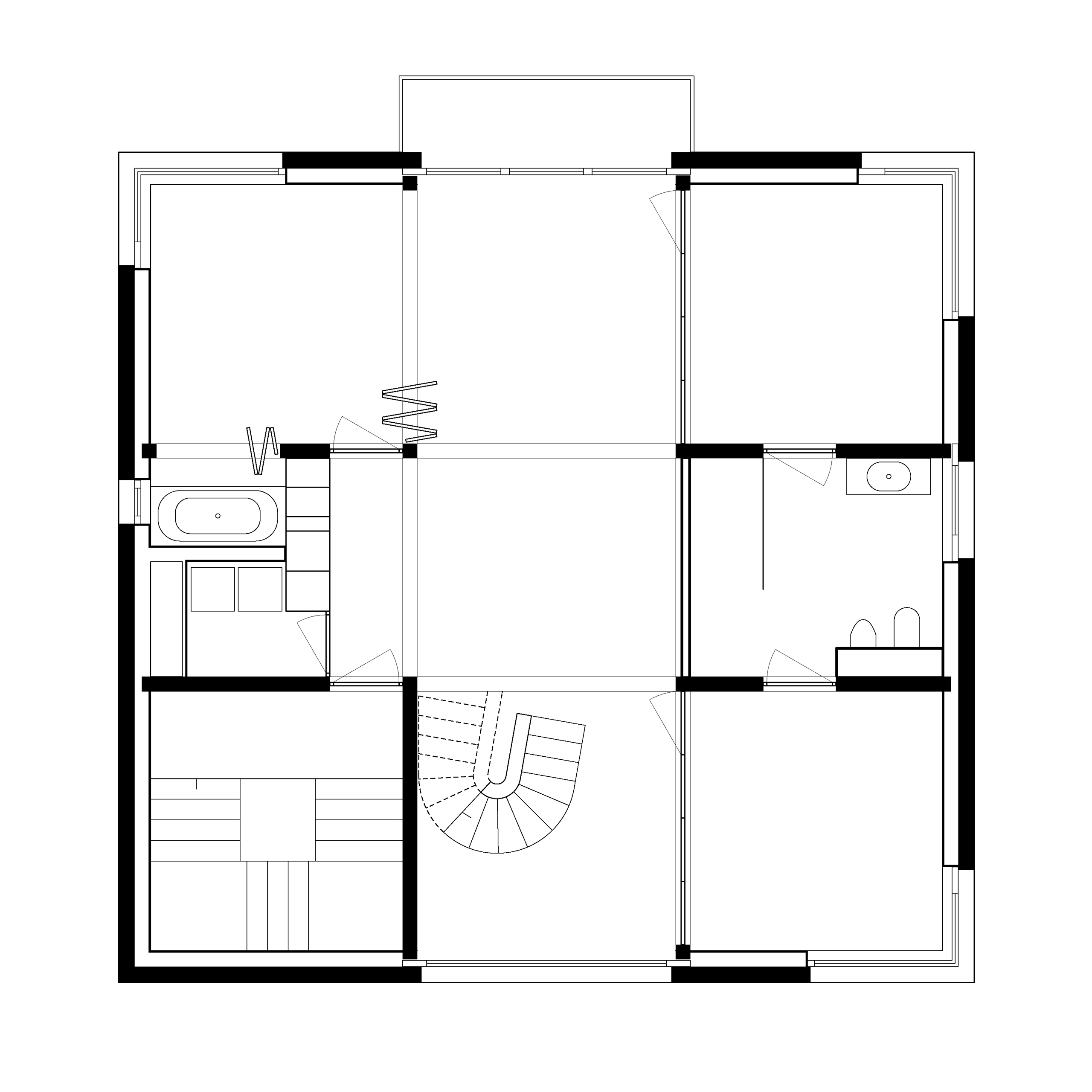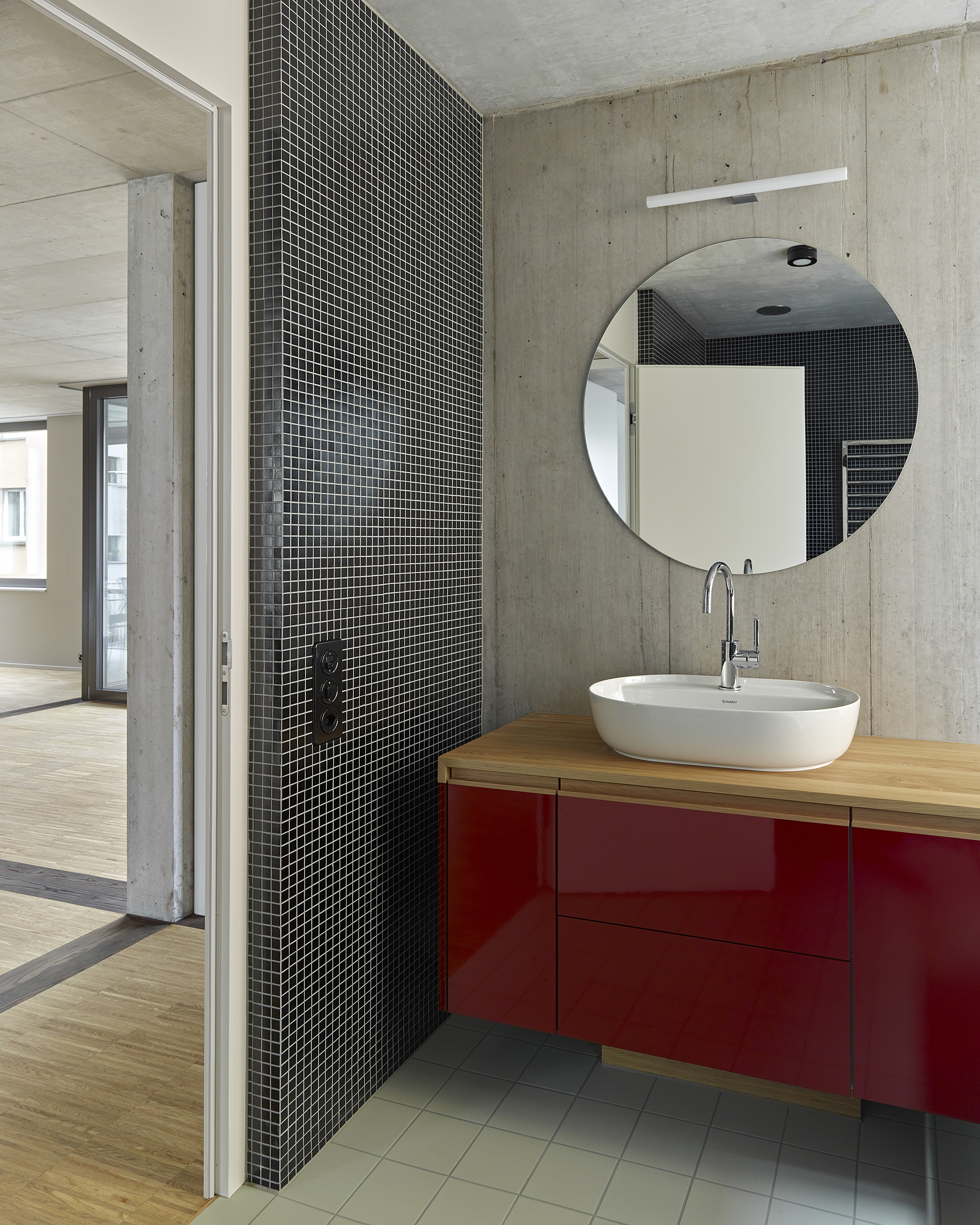 Der Grundriss ist in neun praktisch gleich grosse Einheiten gegliedert. Eine davon belegt das grosszügige allgemeine Treppenhaus, zwei die Kerne mit Nasszellen und eine Einheit beherbergt jeweils die Küche. Die restlichen fünf Räume sind beliebig nutzbar. Je nach Bedürfnis lässt sich der Grundriss von einer offenen Loft zur klassischen Wohnung mit vier abschliessbaren Zimmern transformieren.