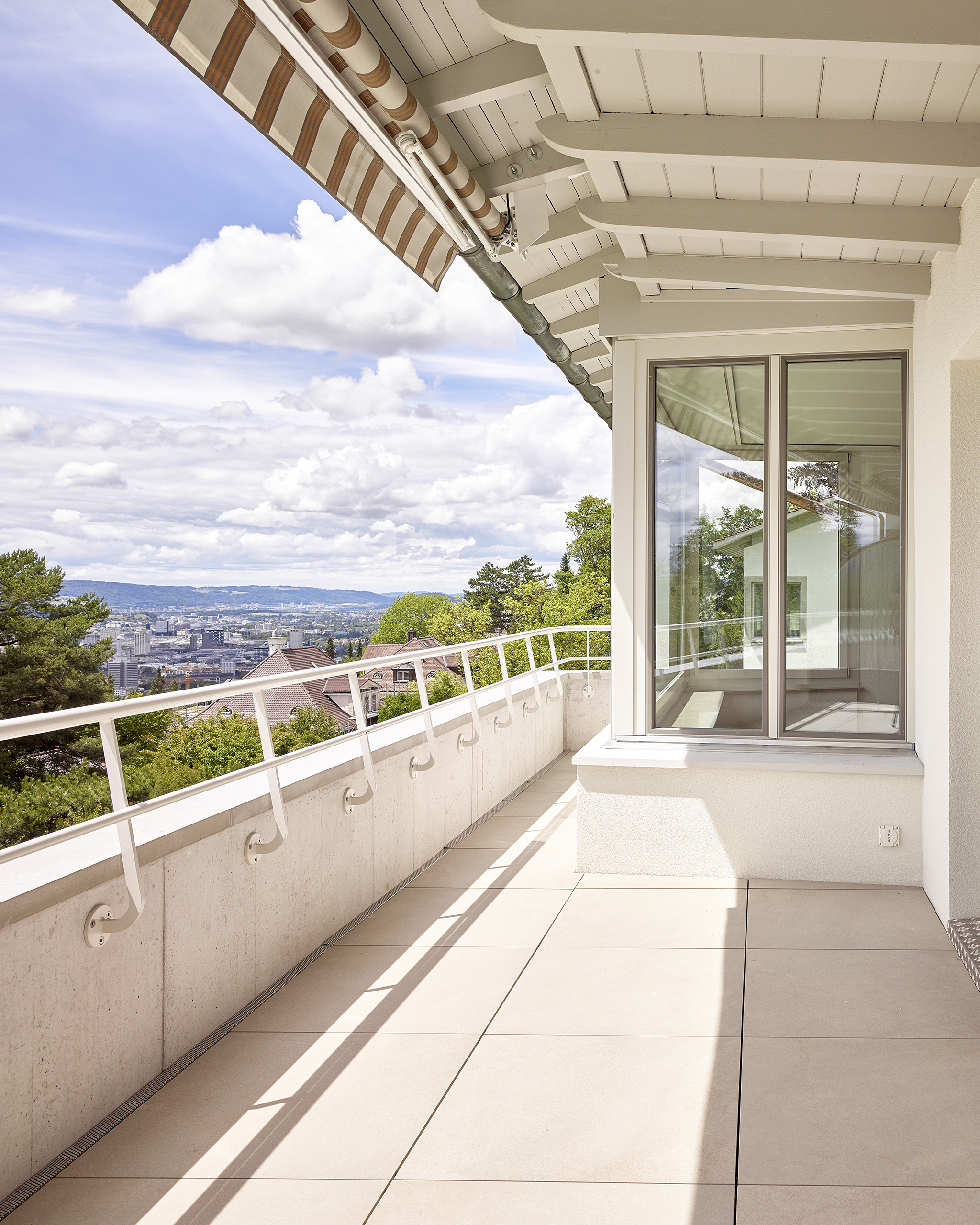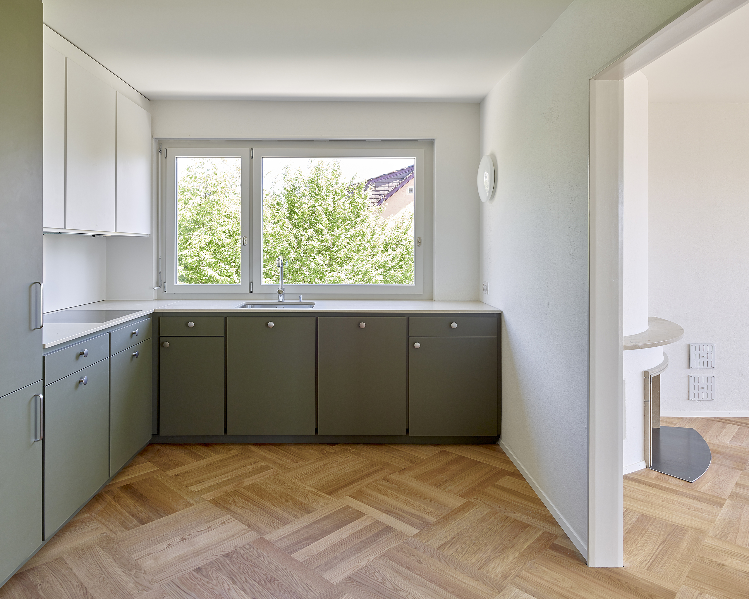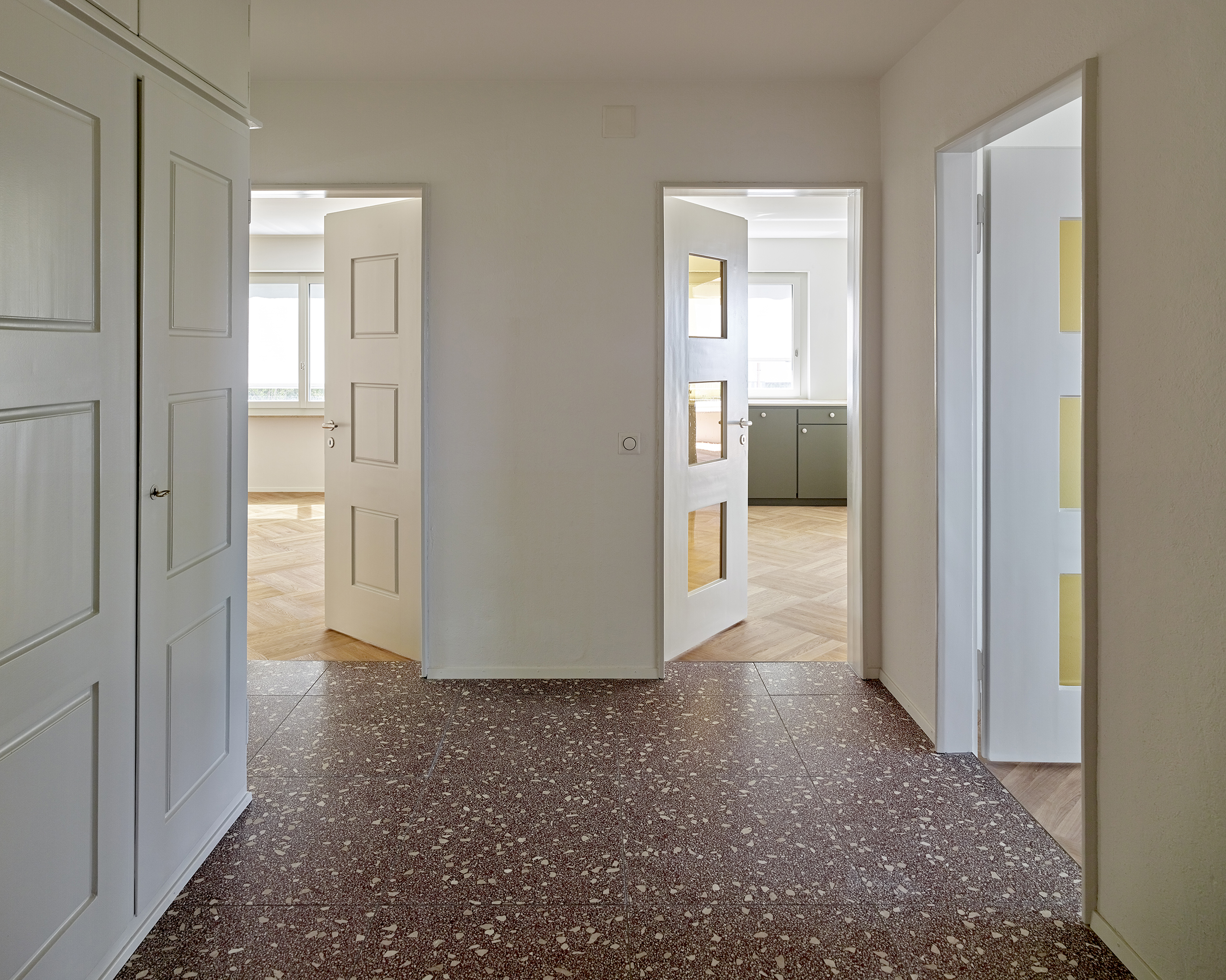 Die Atmosphäre und die Grundrisse dieser fein detaillierten Altbauten wurden weitgehend erhalten. Die Küchen und Bäder erhielten durch die Neuorganisation eine den Wohnungen entsprechende Grosszügigkeit. Ebenso die Balkone, deren Tiefe fast verdoppelt wurde. Die Materialien zur Umsetzung der hinzugefügten Elemente im Innen- und Aussenraum sind zeitgemäss, viele Gestaltungsthemen jedoch der Ursprungszeit der Bauten entliehen. So verschmelzen alt und neu zu einem stimmungsvollen Ganzen.