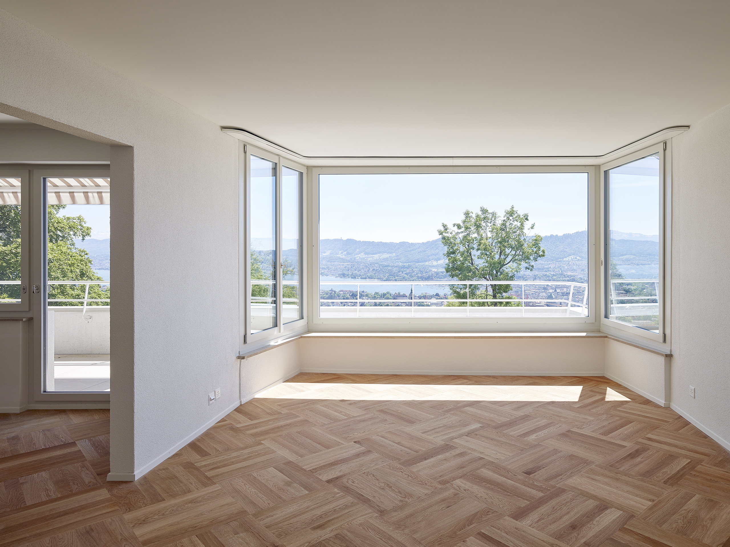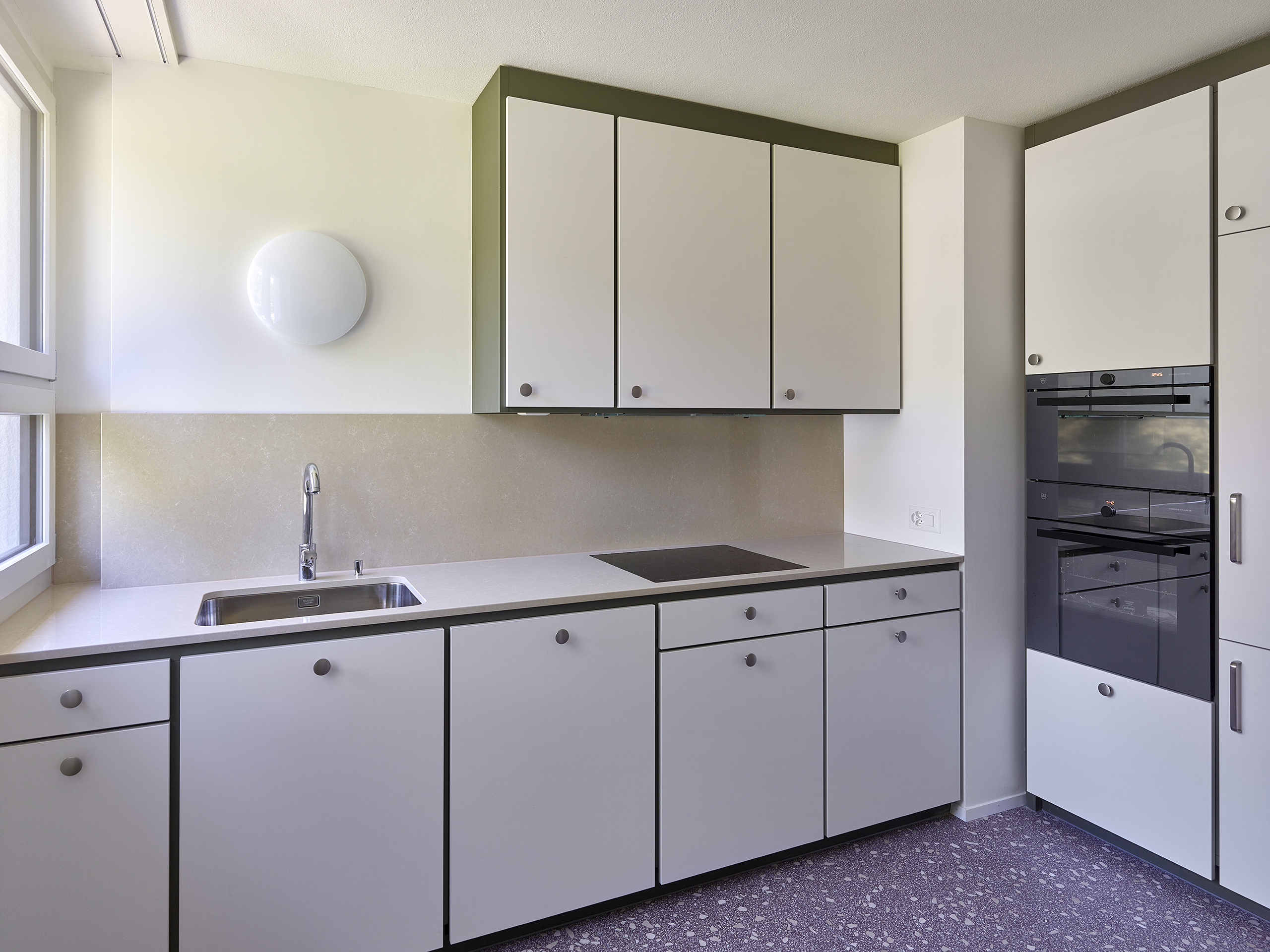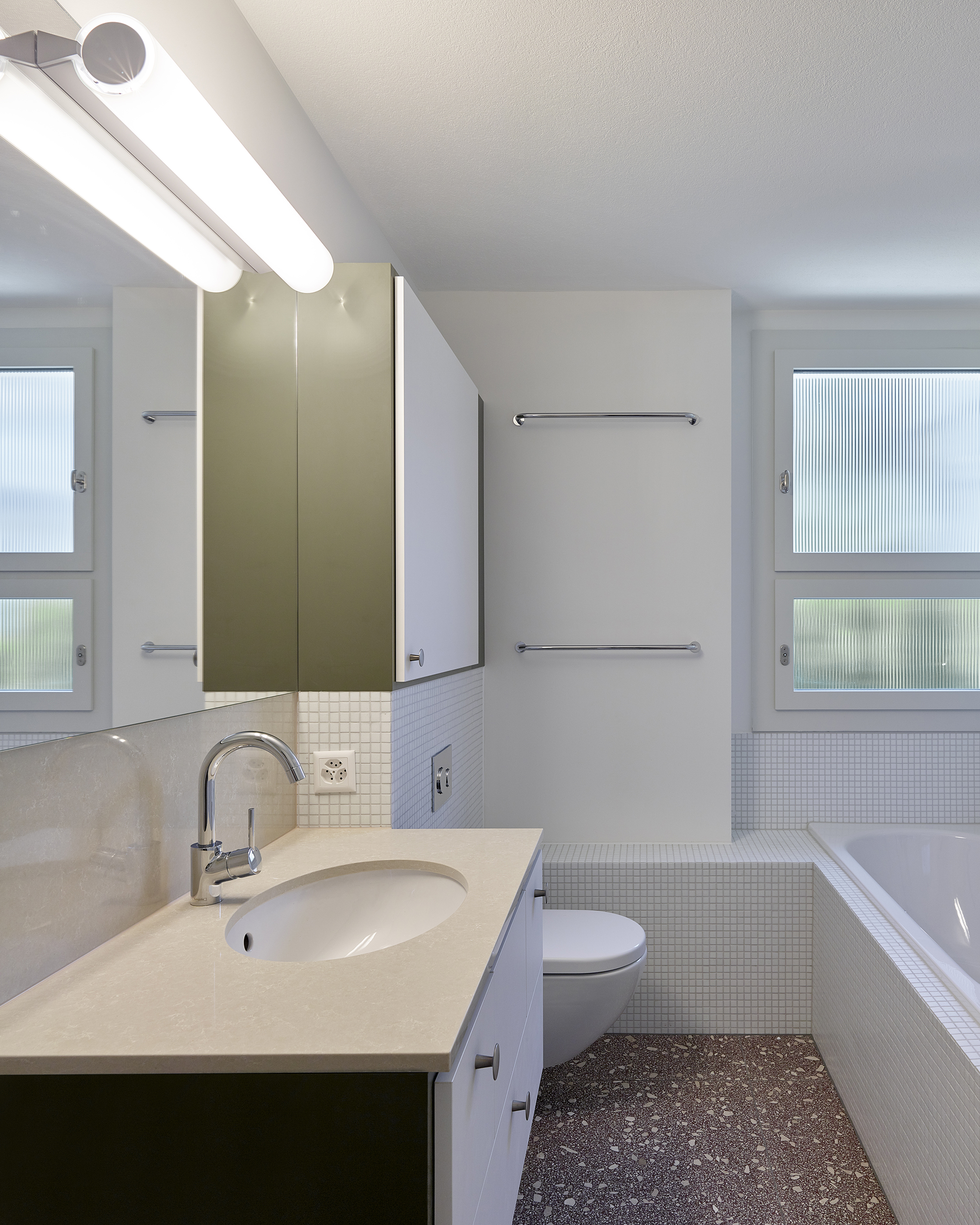 Die Atmosphäre und die Grundrisse dieser fein detaillierten Altbauten wurden weitgehend erhalten. Die Küchen und Bäder erhielten durch die Neuorganisation eine den Wohnungen entsprechende Grosszügigkeit. Ebenso die Balkone, deren Tiefe fast verdoppelt wurde. Die Materialien zur Umsetzung der hinzugefügten Elemente im Innen- und Aussenraum sind zeitgemäss, viele Gestaltungsthemen jedoch der Ursprungszeit der Bauten entliehen. So verschmelzen alt und neu zu einem stimmungsvollen Ganzen.