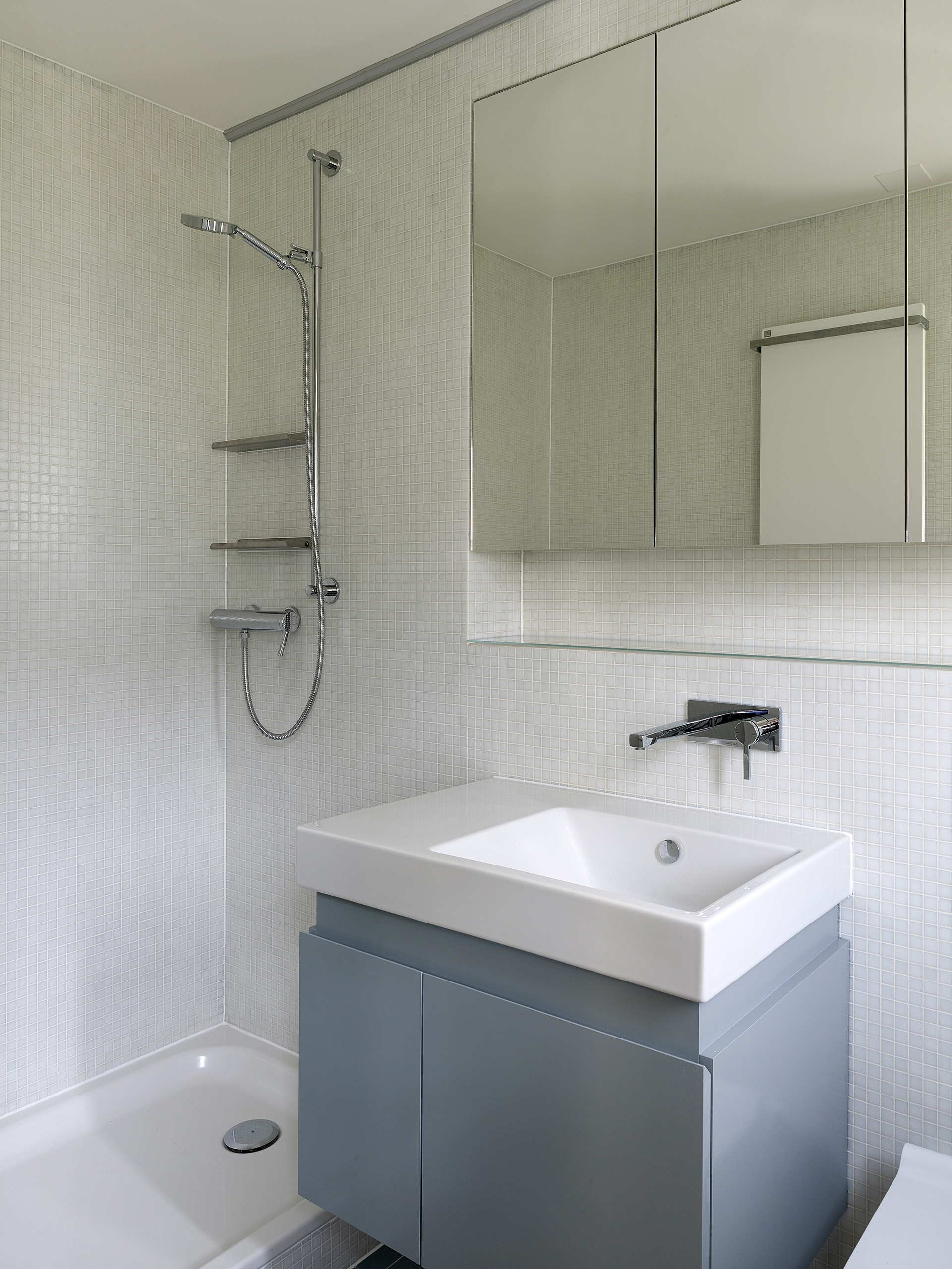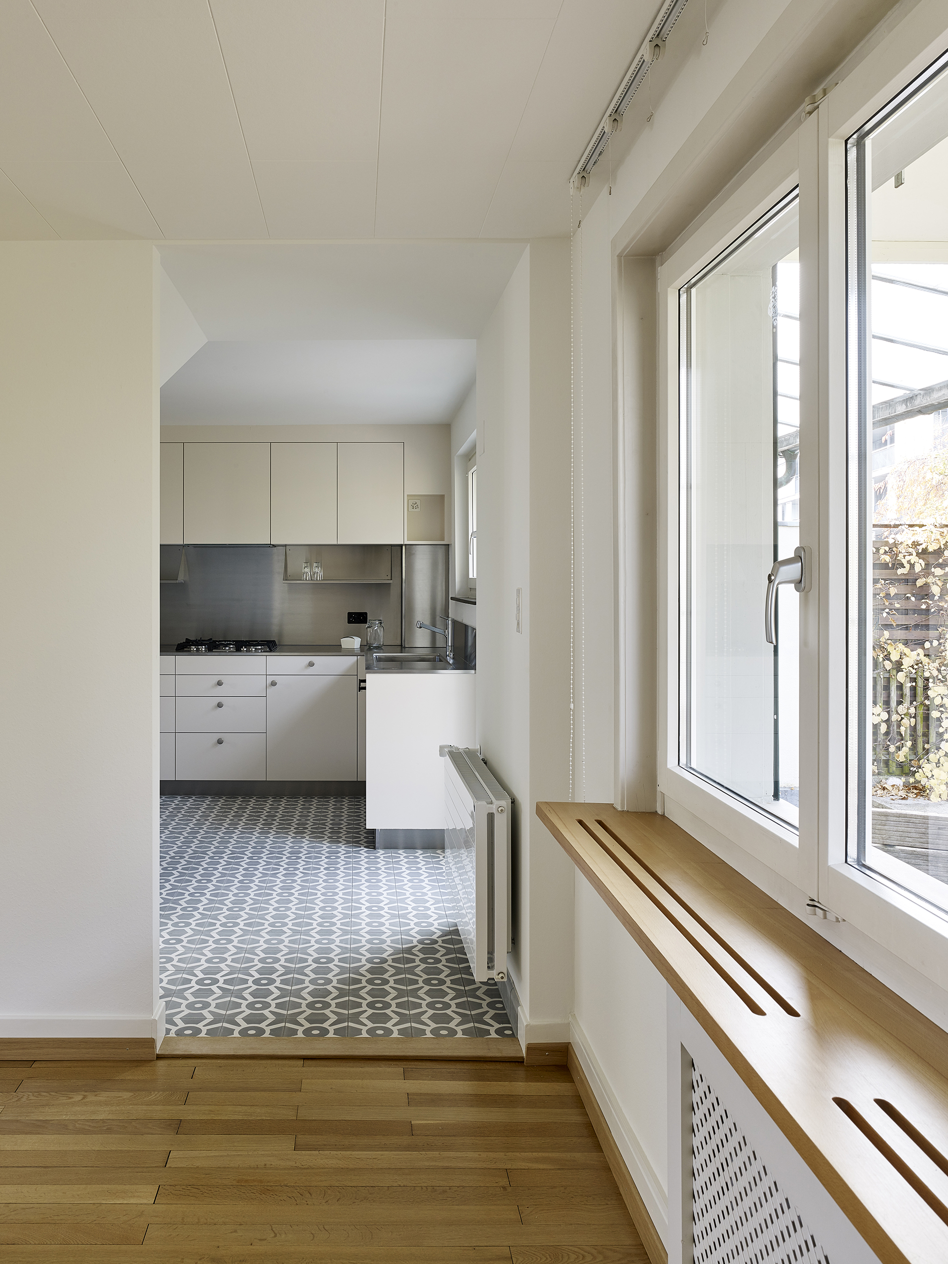 Das kleine typische Blüemliquartier-Haus aus den 30-er Jahren wurde bereits mehrmals umgebaut und renoviert. Die neuen Besitzer wollten die Raumaufteilung wie vorgefunden übernehmen. Einzig die Verbindung zwischen Küche und Wohn-Essraum soll wiederhergestellt werden. Eine neue Einbauküche und die komplette Sanierung des Badezimmers waren zudem notwendig. Hier konnte durch den Rückbau aller Boden- und Deckenschichten an Raumhöhe gewonnen werden. Mit den neuen kontrastierenden Belägen und exakt eingepassten Möbeln in hellen Farbtönen konnte eine grosszügige, frische Wirkung erzeugt werden.