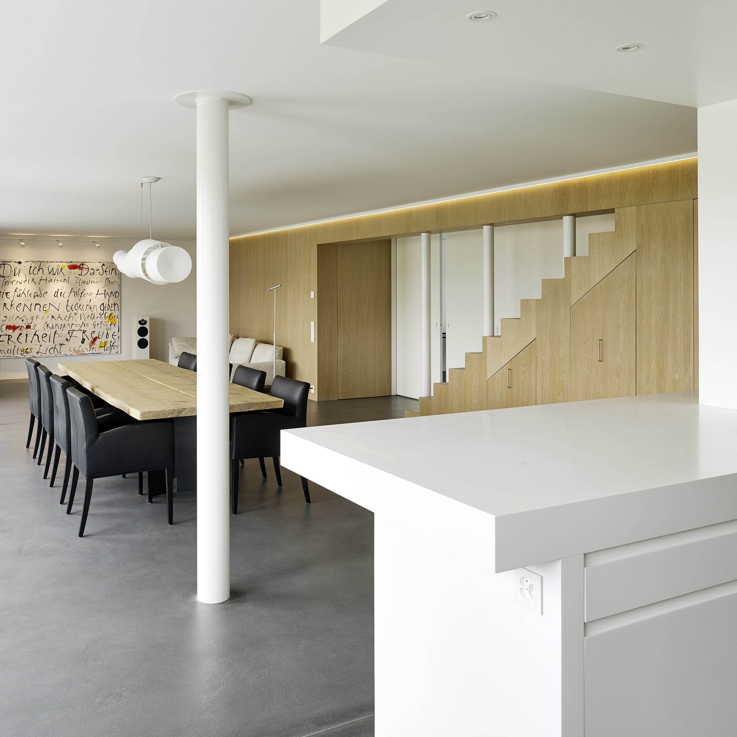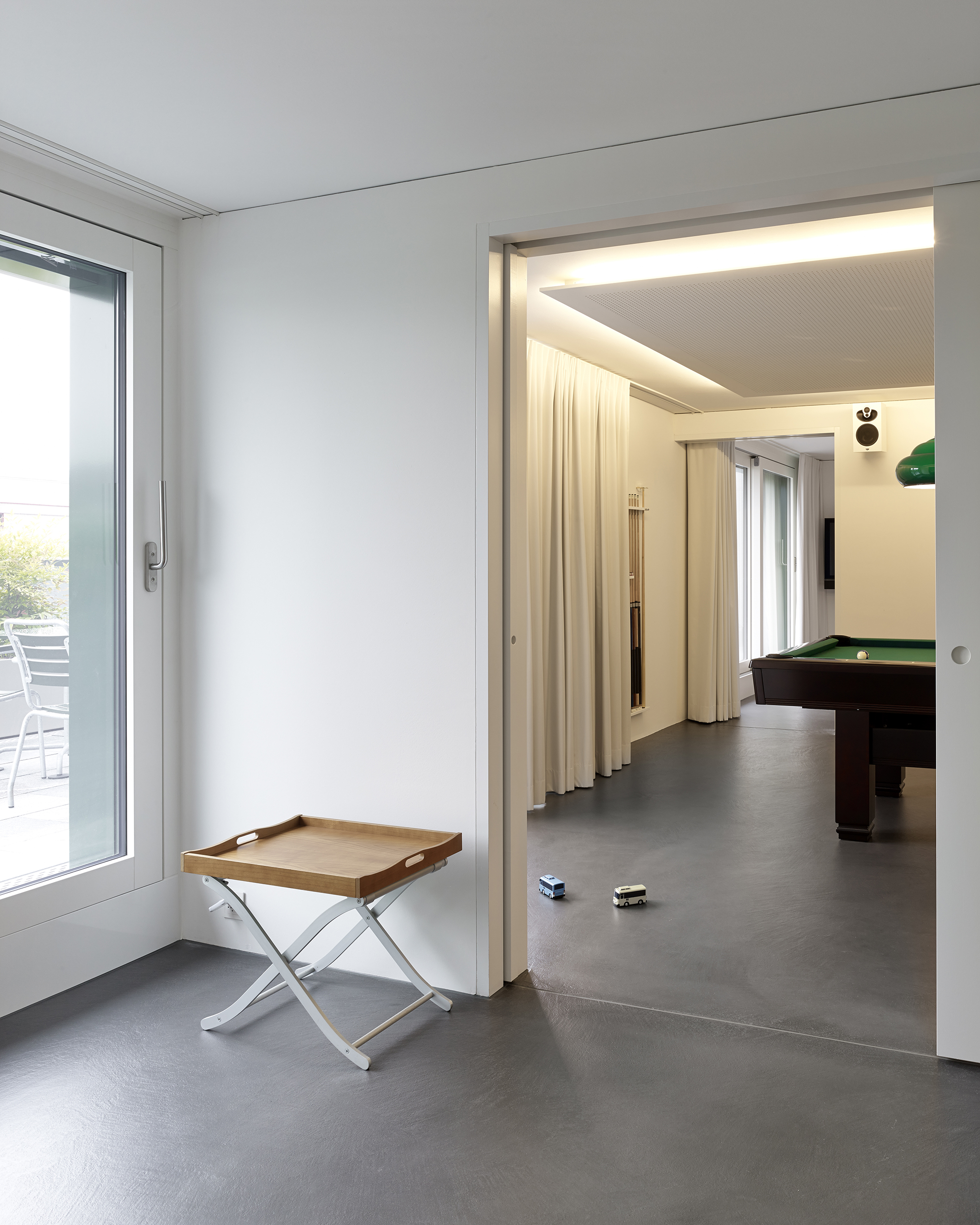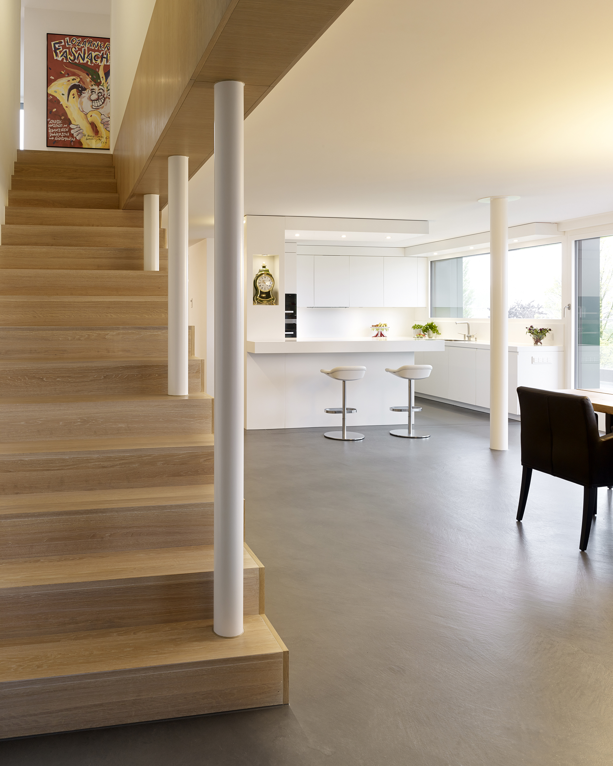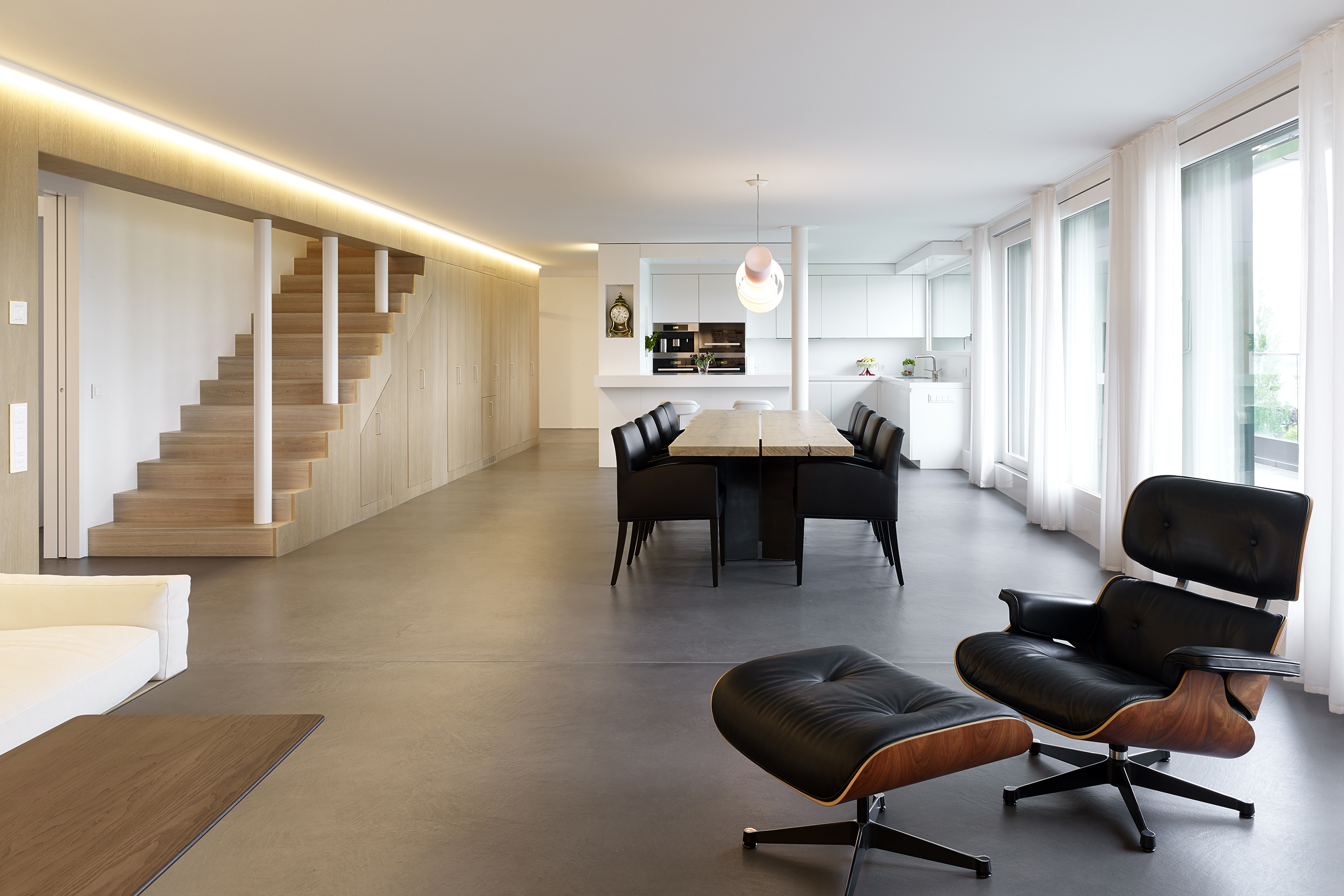 Die verwinkelte Attikawohnung aus den 1980-er Jahren mit zusätzlichen Technikräumen auf dem Dach wurde zu einer fliessenden Wohnlandschaft, ähnlich einer Loft umgebaut. Die Öffnungen der Räume über die ganze Gebäudetiefe ermöglichen das Sonnenlicht von Süden und die Aussicht im Norden gleichzeitig einzufangen. Der Dachgarten wird durch die neuen Treppen direkter an das Wohngeschoss angebunden. Hochwertige, aber schlichte Materialien in Kombination mit ausgesuchten Möbelstücken erzeugen eine gediegene Raumatmosphäre