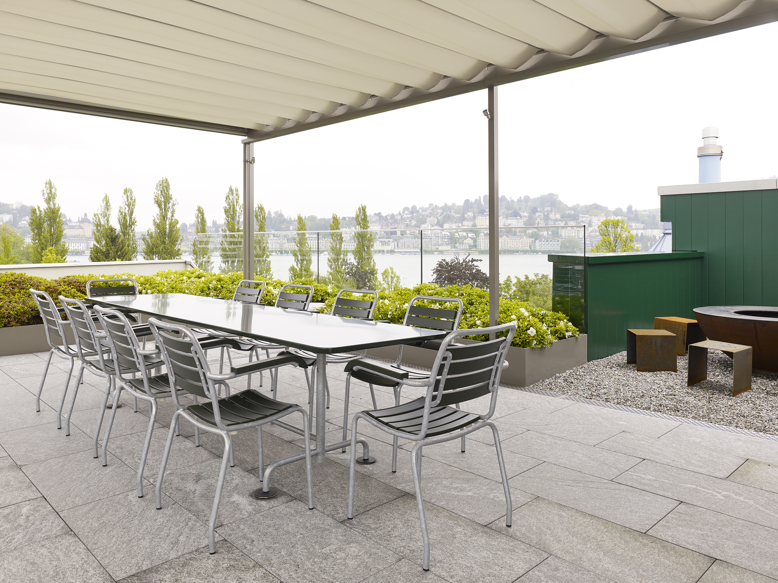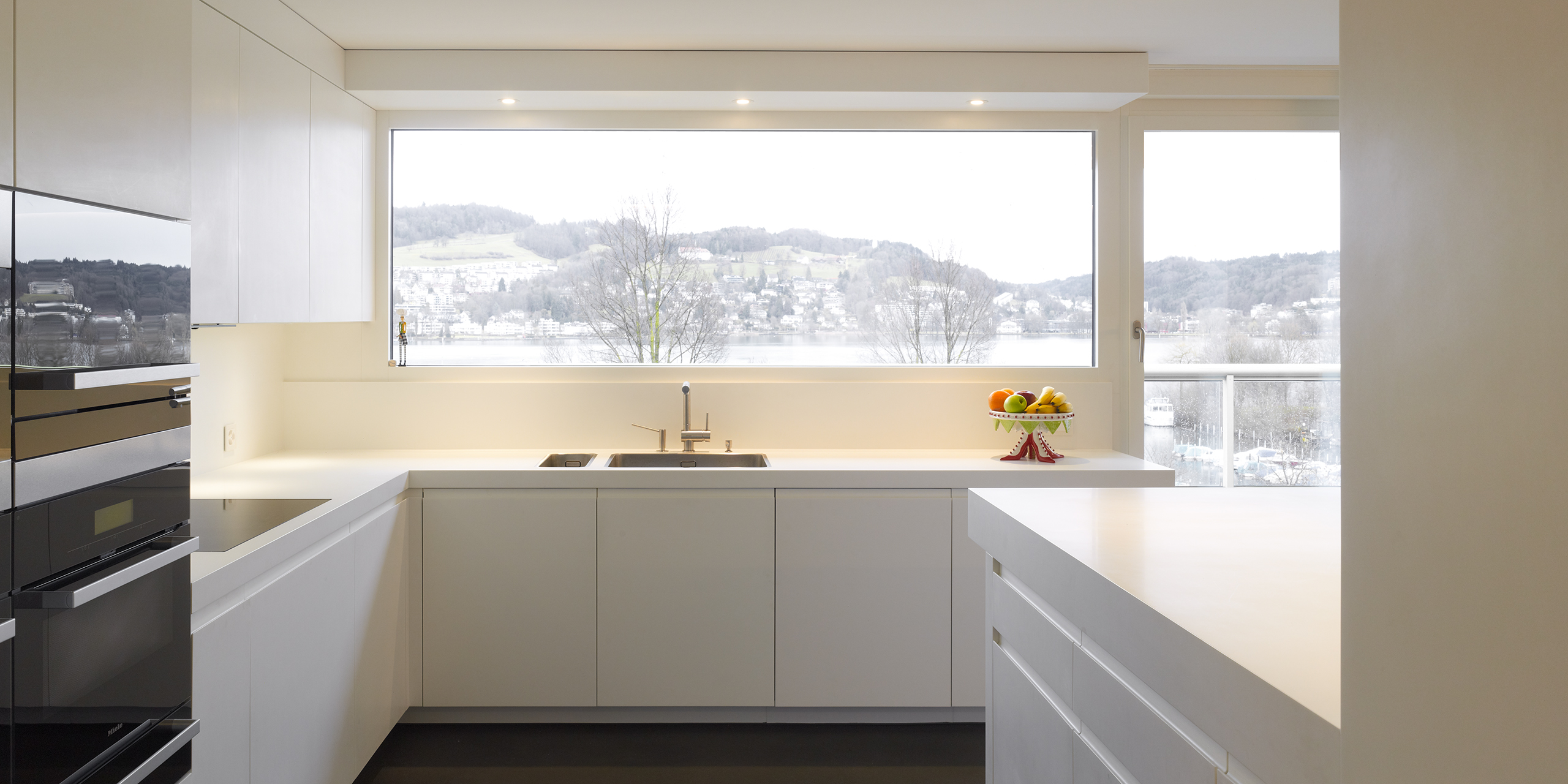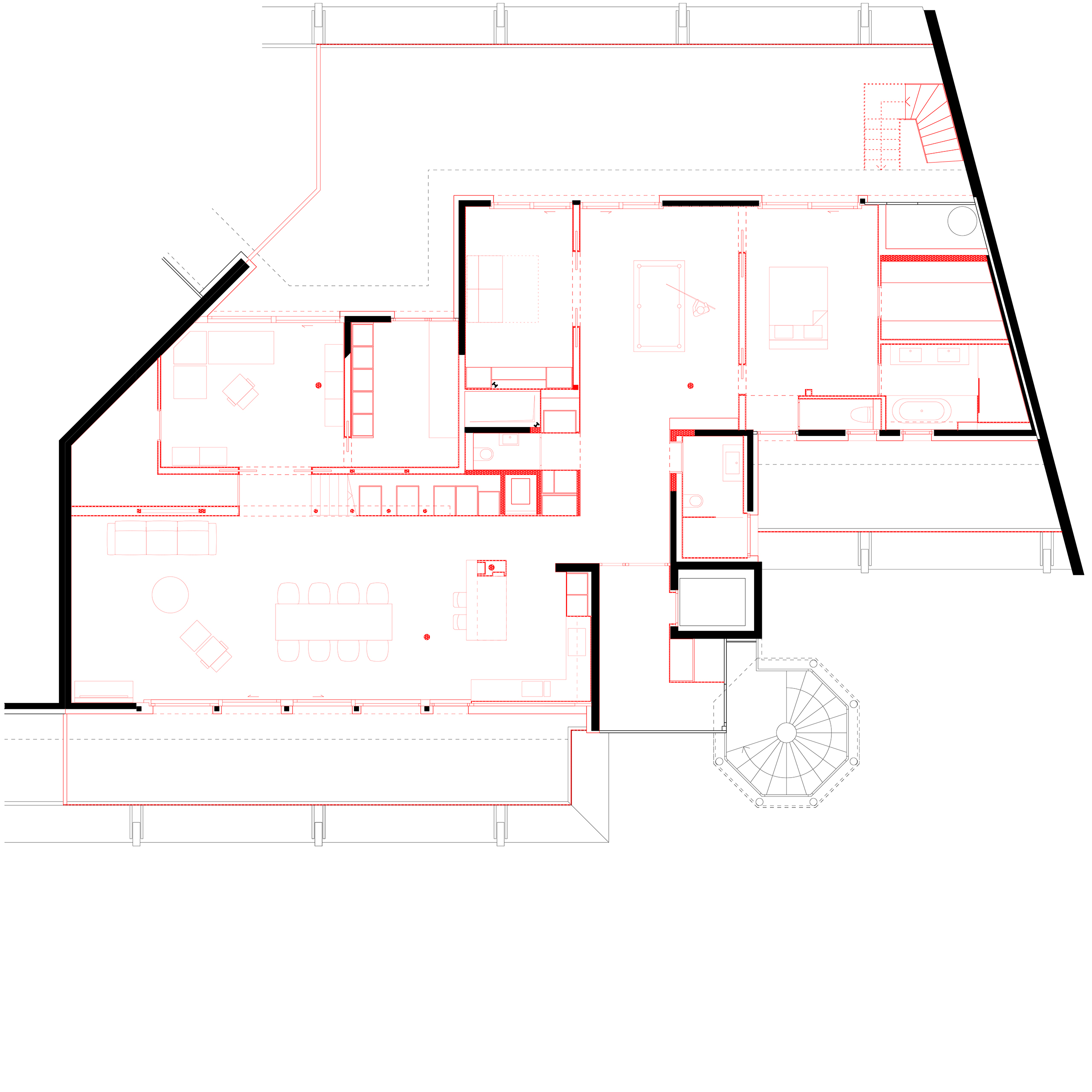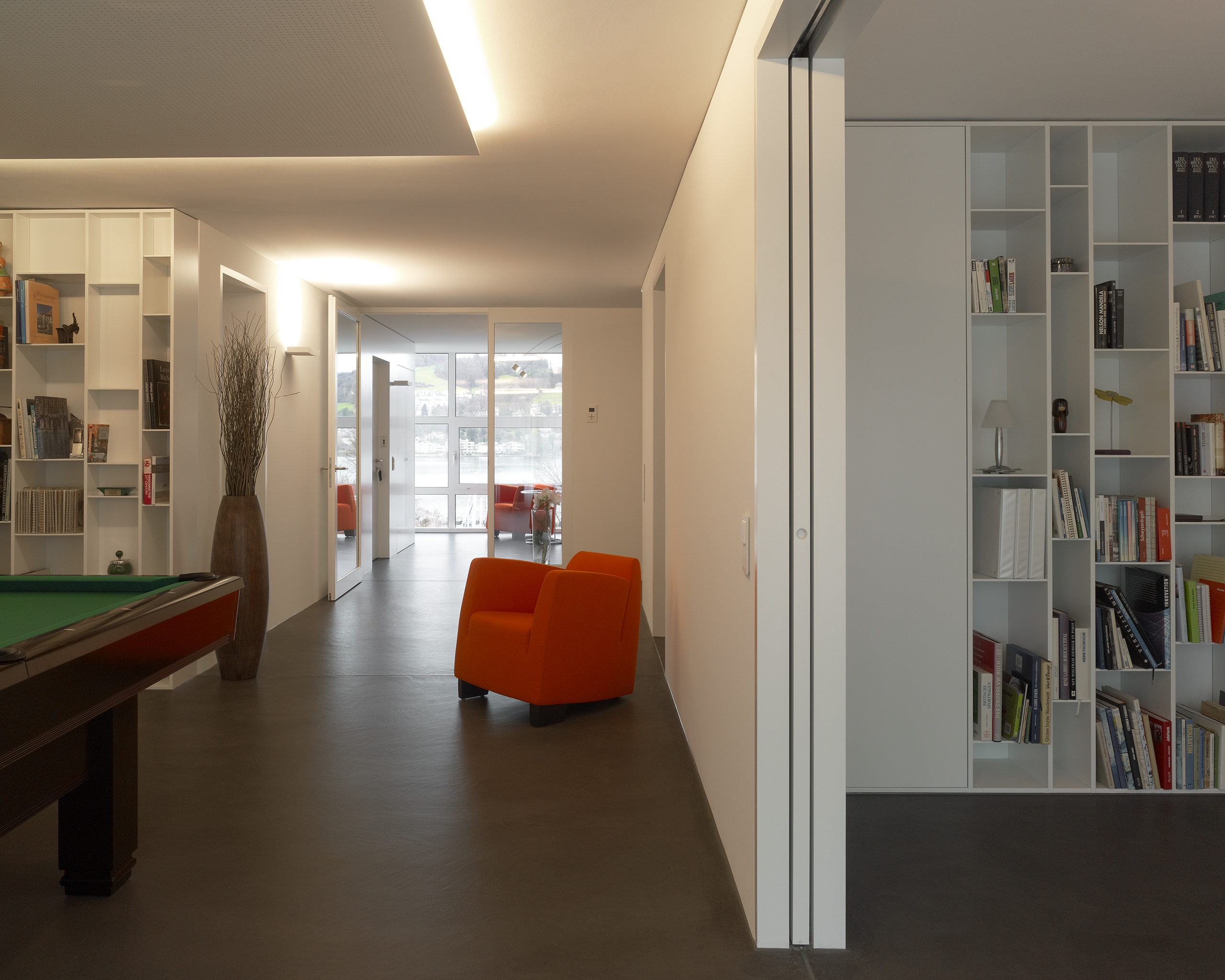 Die verwinkelte Attikawohnung aus den 1980-er Jahren mit zusätzlichen Technikräumen auf dem Dach wurde zu einer fliessenden Wohnlandschaft, ähnlich einer Loft umgebaut. Die Öffnungen der Räume über die ganze Gebäudetiefe ermöglichen das Sonnenlicht von Süden und die Aussicht im Norden gleichzeitig einzufangen. Der Dachgarten wird durch die neuen Treppen direkter an das Wohngeschoss angebunden. Hochwertige, aber schlichte Materialien in Kombination mit ausgesuchten Möbelstücken erzeugen eine gediegene Raumatmosphäre