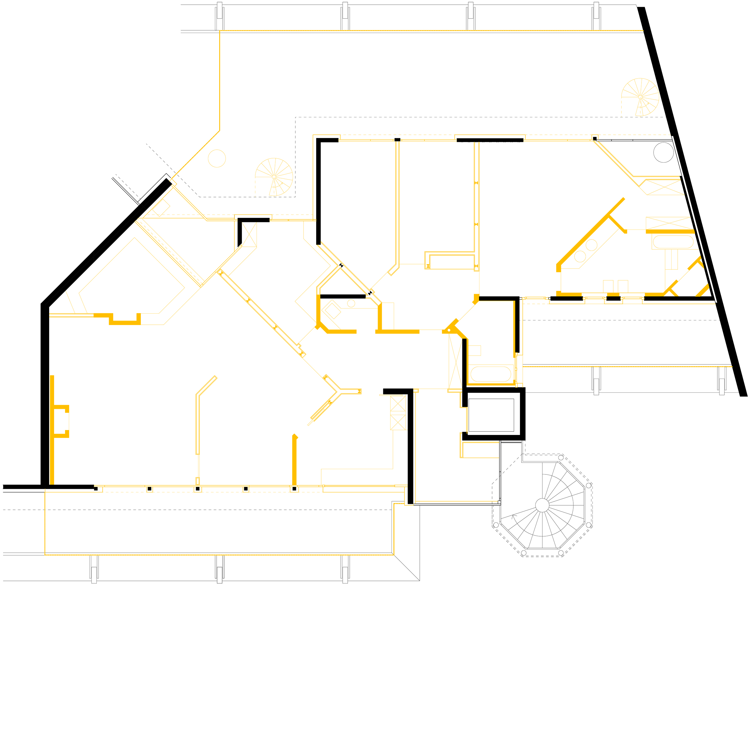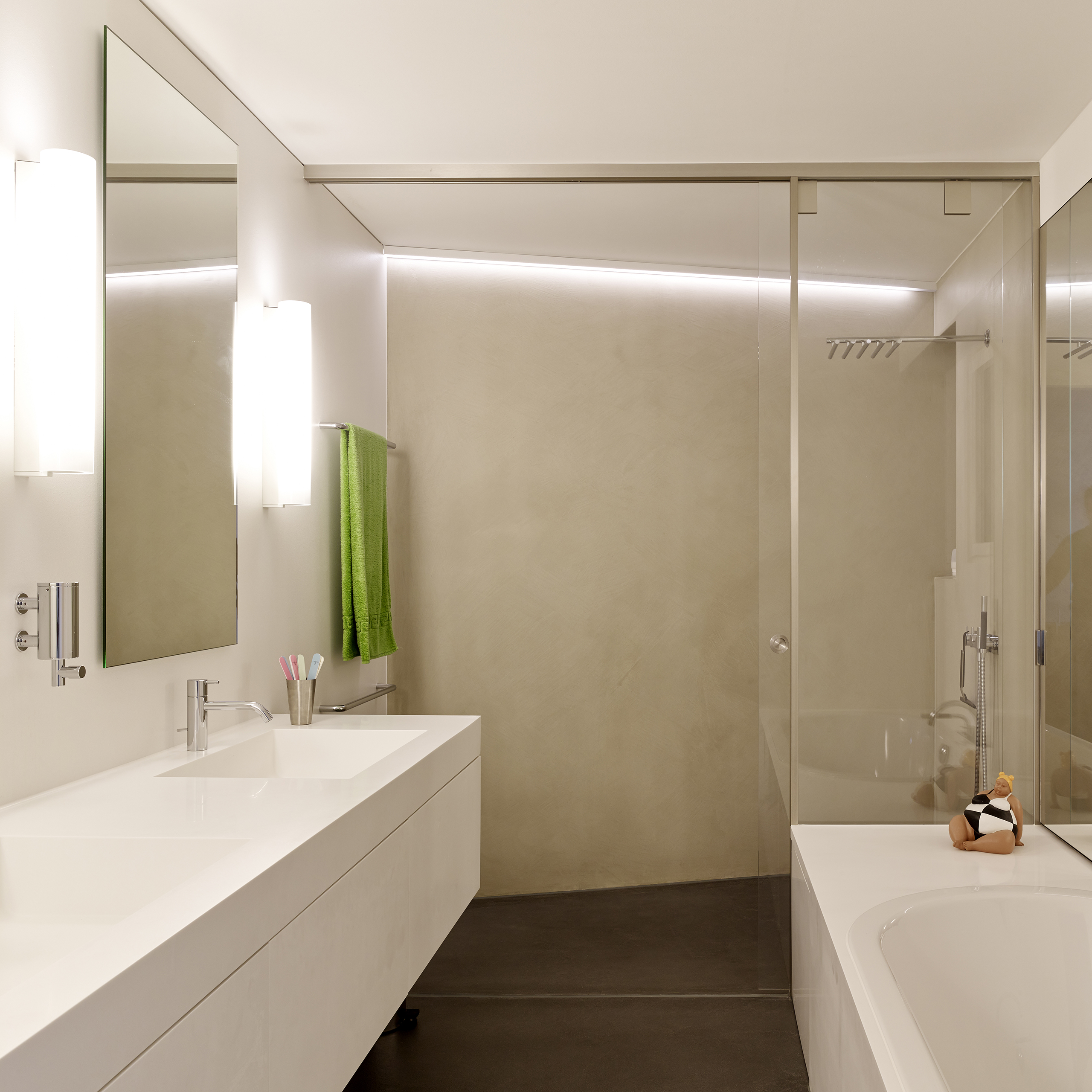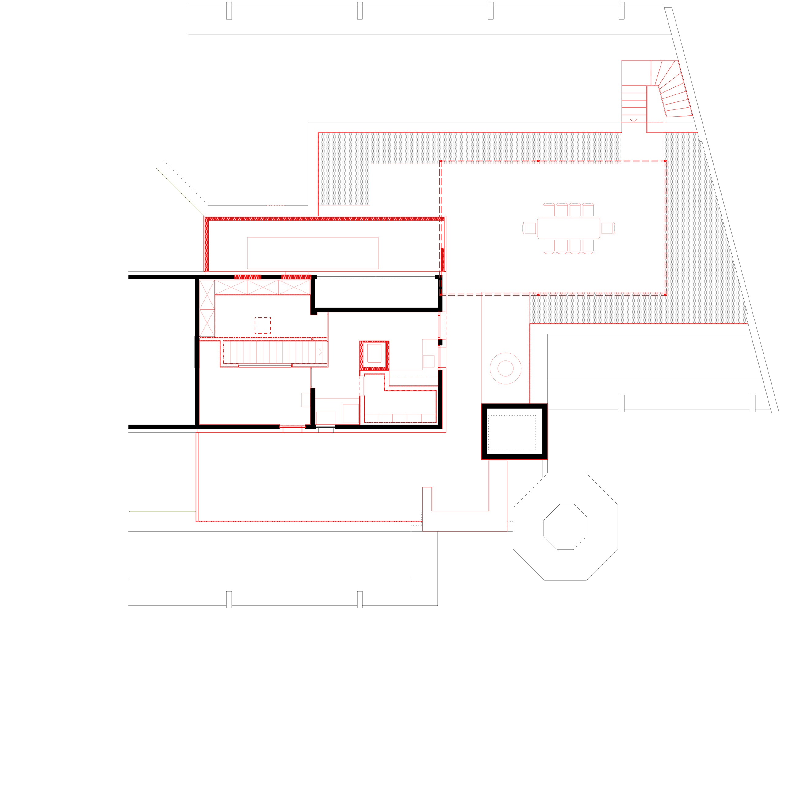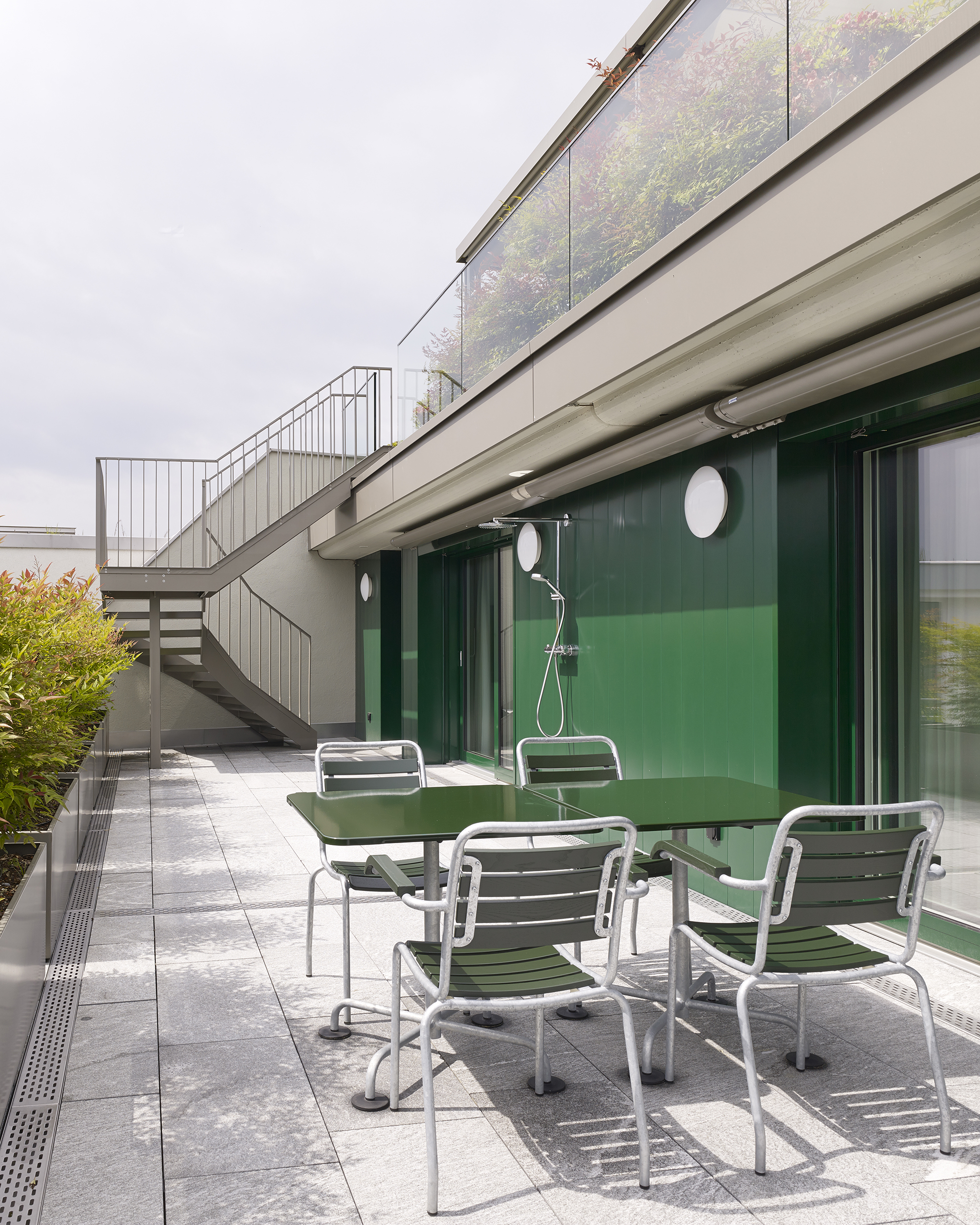 Die verwinkelte Attikawohnung aus den 1980-er Jahren mit zusätzlichen Technikräumen auf dem Dach wurde zu einer fliessenden Wohnlandschaft, ähnlich einer Loft umgebaut. Die Öffnungen der Räume über die ganze Gebäudetiefe ermöglichen das Sonnenlicht von Süden und die Aussicht im Norden gleichzeitig einzufangen. Der Dachgarten wird durch die neuen Treppen direkter an das Wohngeschoss angebunden. Hochwertige, aber schlichte Materialien in Kombination mit ausgesuchten Möbelstücken erzeugen eine gediegene Raumatmosphäre