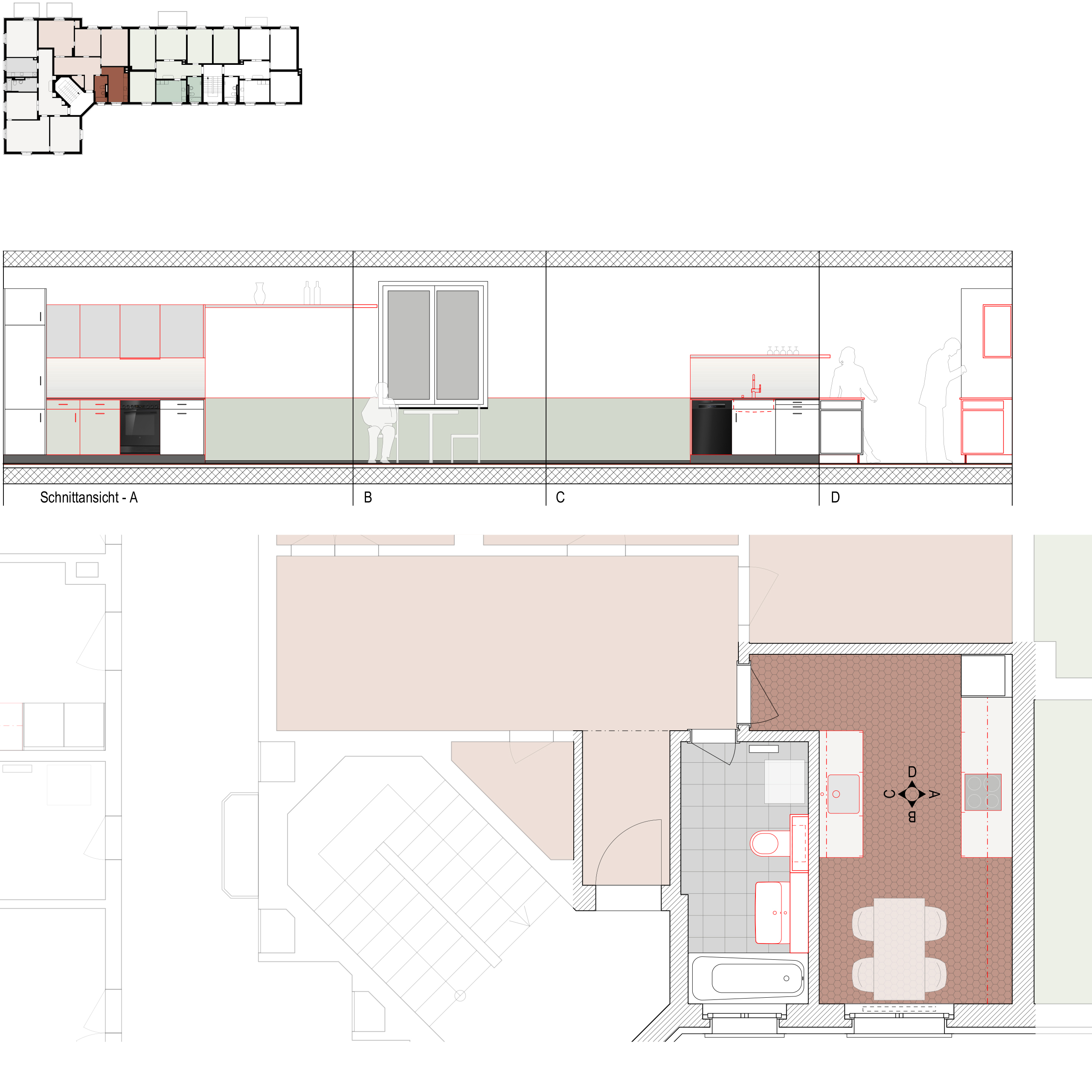 Im Familienalltag bildet der Küchentisch das Zentrum des Geschehens. Um diesem mehr Raum und Tageslicht zu schaffen, werden die Küchenelemente umorganisiert: In den 3-Zi. Wohnungen Haus Nr. 21 wird eine Zeile mit Spülbecken an die Wand zum Bad gelegt, sodass sogar auf einen zusätzlichen Schacht verzichtet werden kann. In den Küchen im Haus Nr. 23 ist der ganze Arbeitsteil auf die gegenüberliegende Raumseite gespiegelt, eine neue Steigzone im Eckelement angeordnet. Die Korpusse werden übertief vorgeschlagen, um mehr Platz zum Arbeiten und eine einfache Leitungsführung zu bieten.