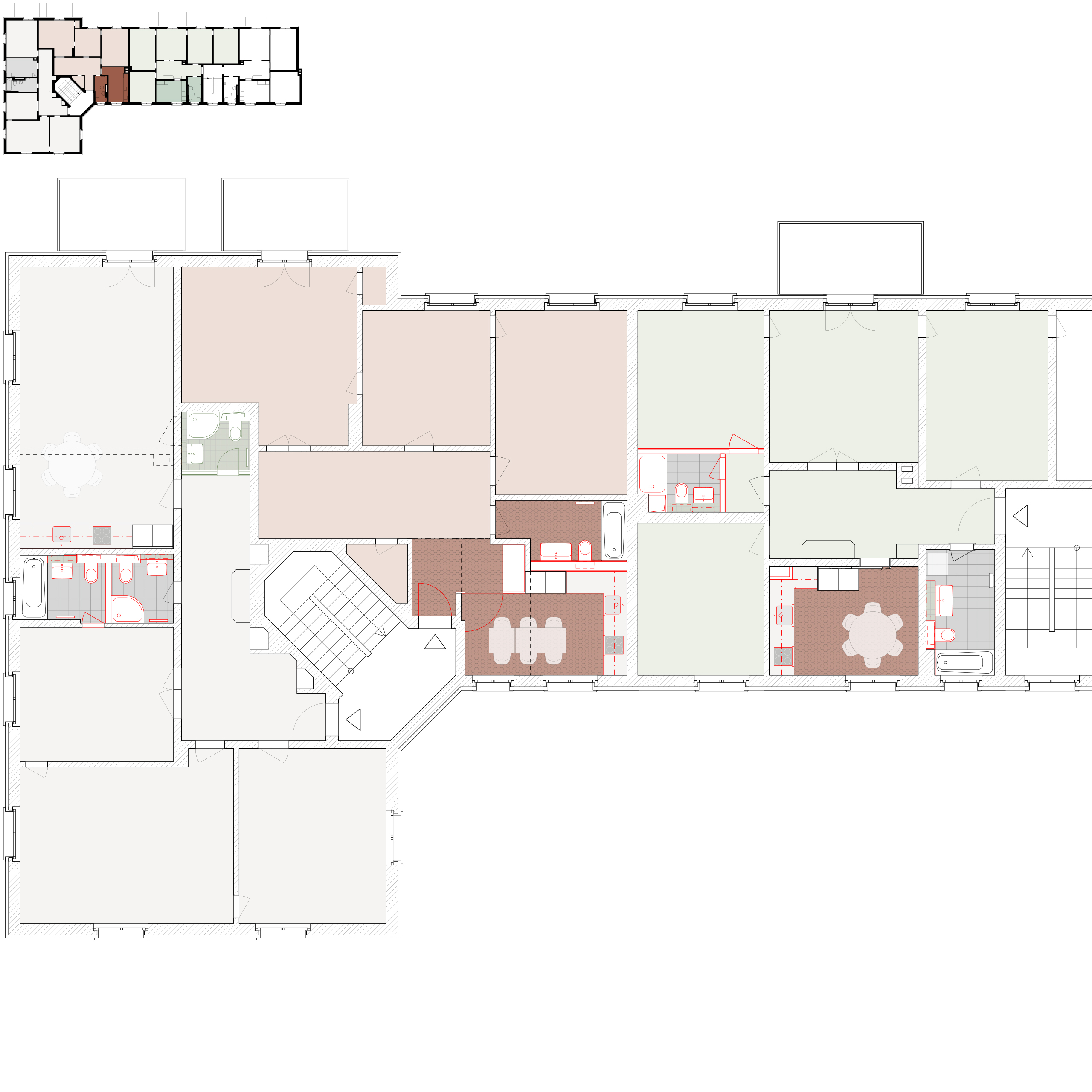 In den 4-Zi. Wohnungen Haus Nr. 21 erlaubt die Raumtiefe des Bades eine Zweiteilung. Das gefangene Bad wird über die gleiche Steigzone erschlossen und mit einer Verglasung in der Trennwand belichtet. Alternativ könnte auch eine kleine Nasszelle am Ende des Korridors eingefügt werden (Variante grün). Dies bedingt allerdings den Abbruch der Trennwand von Küche zu Wohnraum. Dieser Eingriff führt in jedem Fall zu einem zeitgemässen Grundriss. Im Haus Nr. 23 fügt sich ein Duschbad als Vorzone zum hinteren Südzimmer ein. Dieses wird mit den verbleibenden 13 m2 in seiner Nutzung kaum eingeschränkt. Die Steigzone entsteht als logischer Fortsatz der bestehenden Gebäudestruktur. Die zusätzliche Nasszelle mit grosser Dusche verspricht einen beachtlichen Mehrwert.