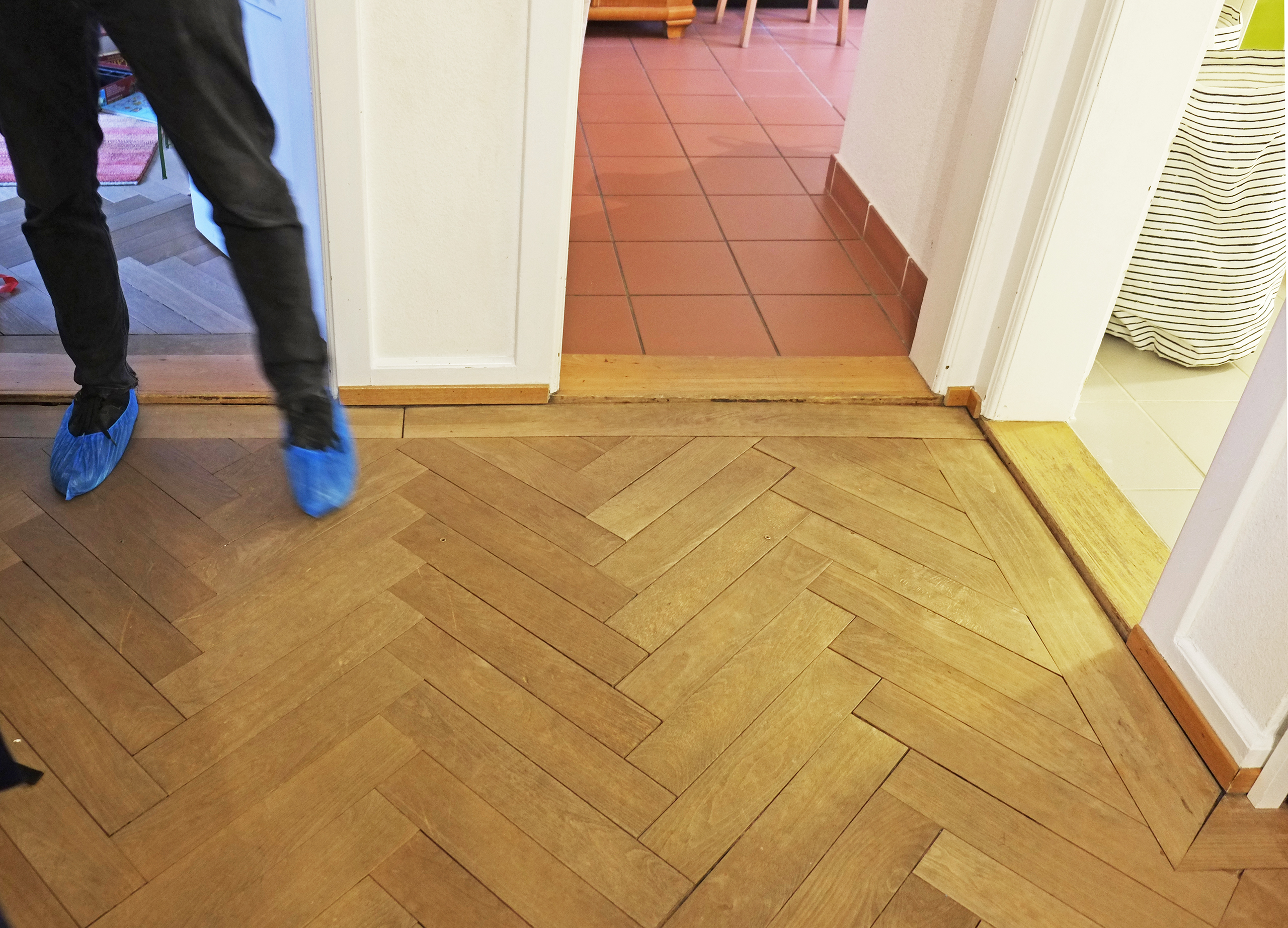 Im Sinne eines Ressourcen schonenden Bauens werden die hochwertigen, noch gut erhaltenen Elemente der Stahlküchen wiederverwendet und mit neuen Teilen aus Holzwerkstoff durch den Schreiner ergänzt. Eine neue eingepasste Arbeitsplatte aus Naturstein bindet die Elemente zusammen. Dabei entsteht ein lebendiges Spiel aus Oberflächen mit unterschiedlicher Haptik und Farben, welches auch im Unterhalt Vorteile mit sich bringt. Ein defektes Bauteil kann auch später ausgewechselt werden und integriert sich trotz Unterschieden selbstverständlich. Die klassischen hexagonalen Bodenplatten werden professionell gereinigt und wo nötig ergänzt. Ein umlaufendes Farbfries unterstreicht die vertikale Gliederung der Räume und lässt die Überhöhe als Qualität erleben. Die Nordseite der Wohnung erhält durch die Farbe eine gewisse Wärme und Introvertiertheit. Diese Ausformulierung unterstreicht die unterschiedliche Atmosphäre zu den Räumen gegen den Hof auf der Südseite.