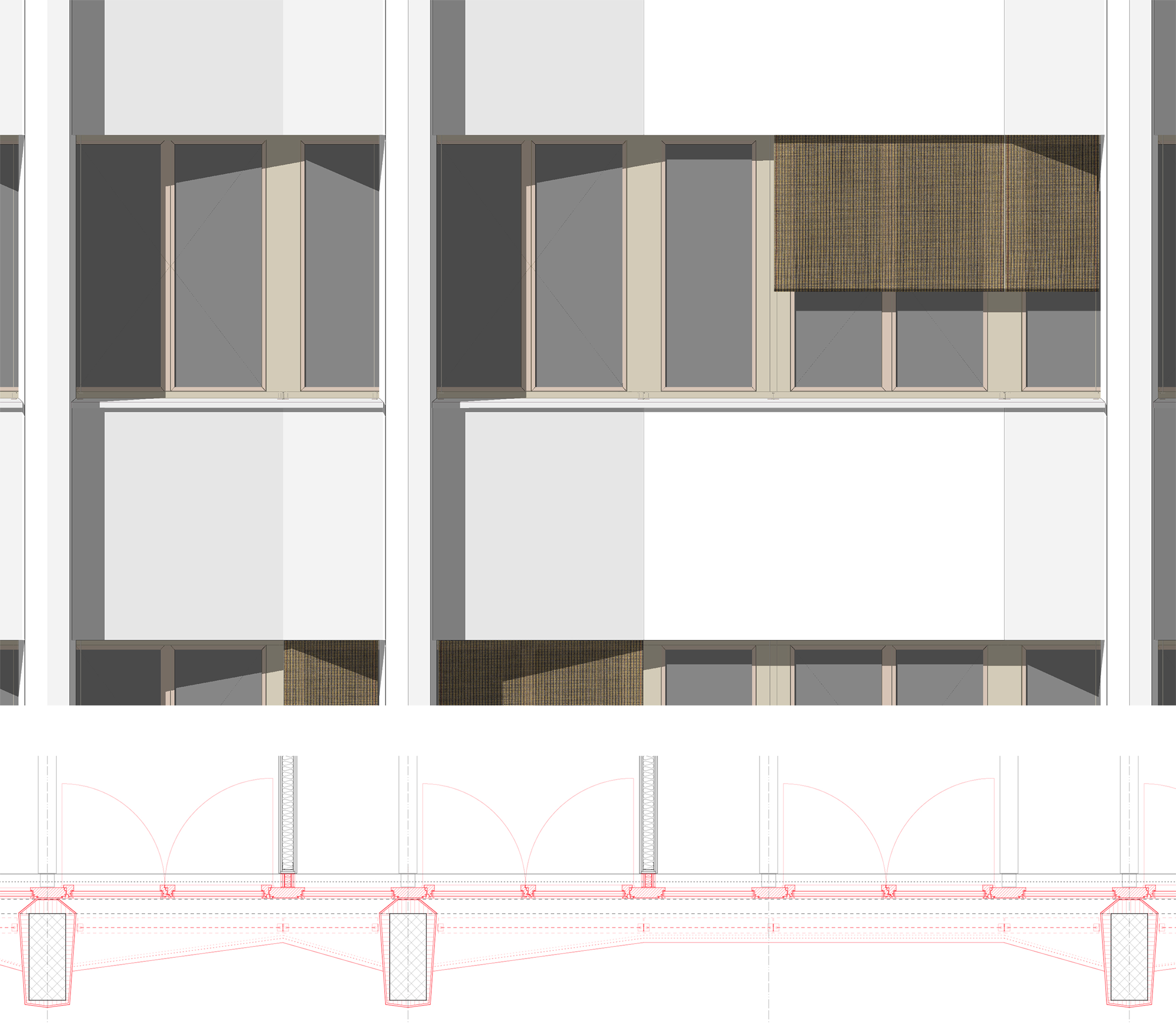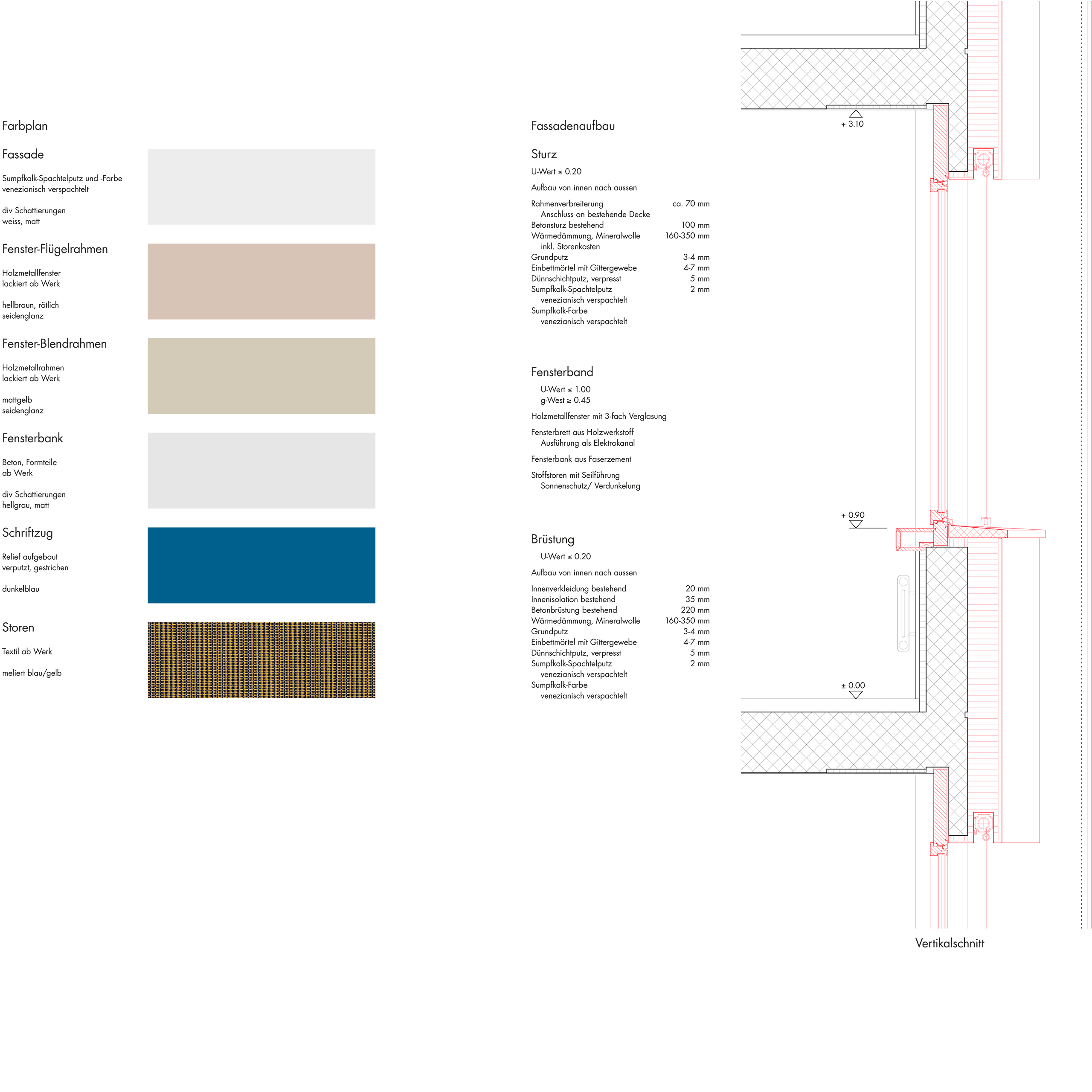 Die tragenden, dem Gebäudekubus vorgestellten Betonpfeiler werden neu vollständig in den Fassadenaufbau integriert. Dies geschieht durch eine raffinierte achteckige und konische Bekleidung der Betonstützen mit vorfabrizierten Wärmedämmelementen. Die neue Stützenform wirkt elegant und leitet direkt in die angrenzenden seitlichen Schotten auf den Brüstungen über.