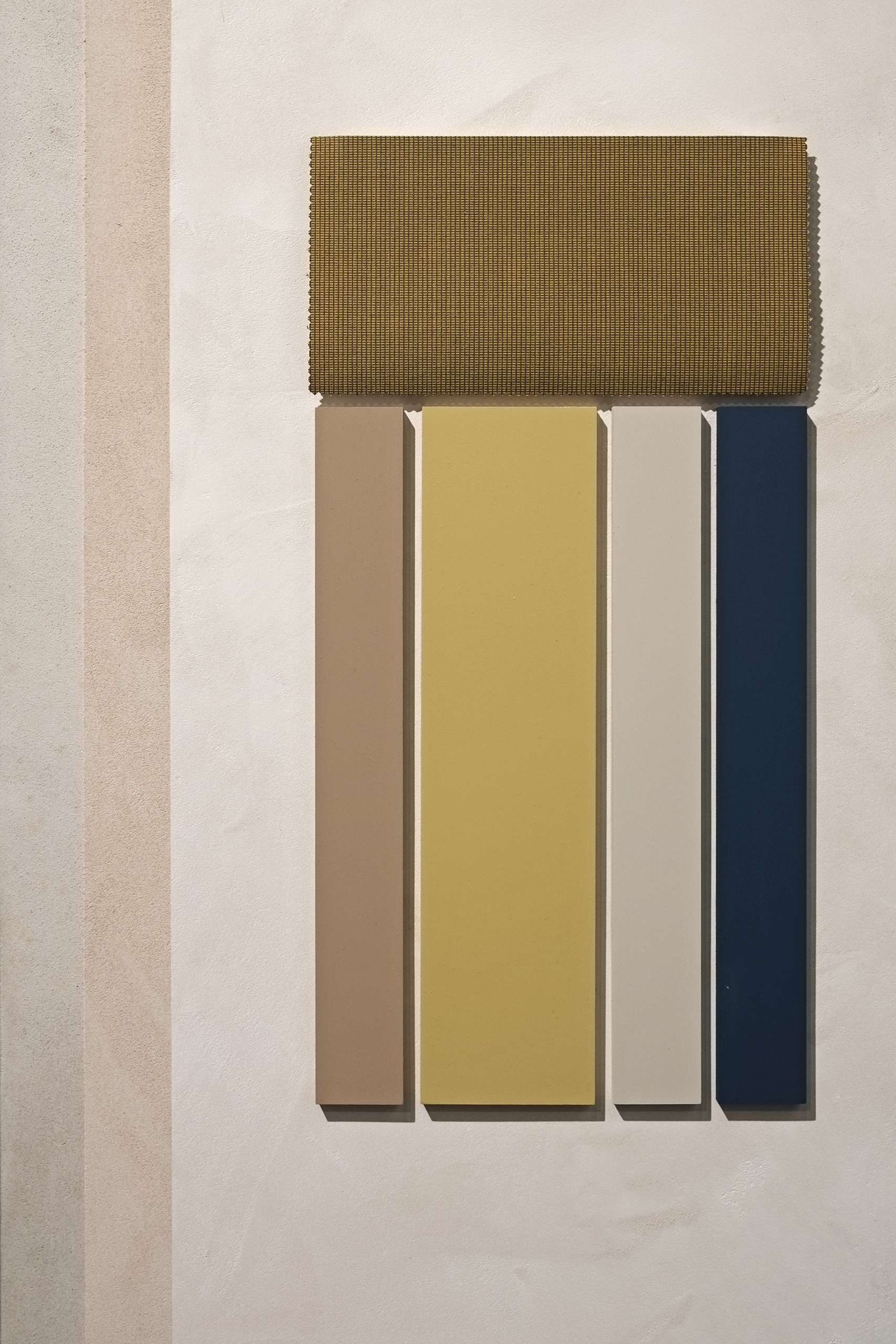 Um die natürliche Kalkputz-Oberfläche in ihrer schlichten Schönheit nicht zu konkurrenzieren, wird weitgehend auf zusätzliche Farbe verzichtet. Dennoch soll die neue, Identität stiftende Bildsprache des SMGV in die Gesamterscheinung integriert werden: die matte Farbigkeit gebrauchter, mit Patina überzogener Werkzeuge und das Blau der Wortbildmarke.