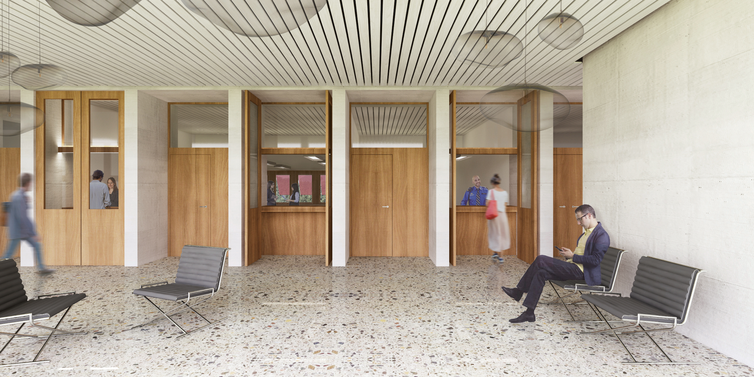 L’utente entra frontalmente in un grande atrio dove incontra i vari sportelli. Un corridoio guida verso gli uffici e le sale di uso pubblico. Ai dipendenti invece è riservata un’entrata separata verso la scala principale e l’intero primo piano. L’organizzazione dei vari locali al pianterreno si ripete al piano superiore: un corridoio centrale affiancato da uno strato di spazi contenente i servizi, le entrate ai locali nonché armadi disponibili e tecnici.