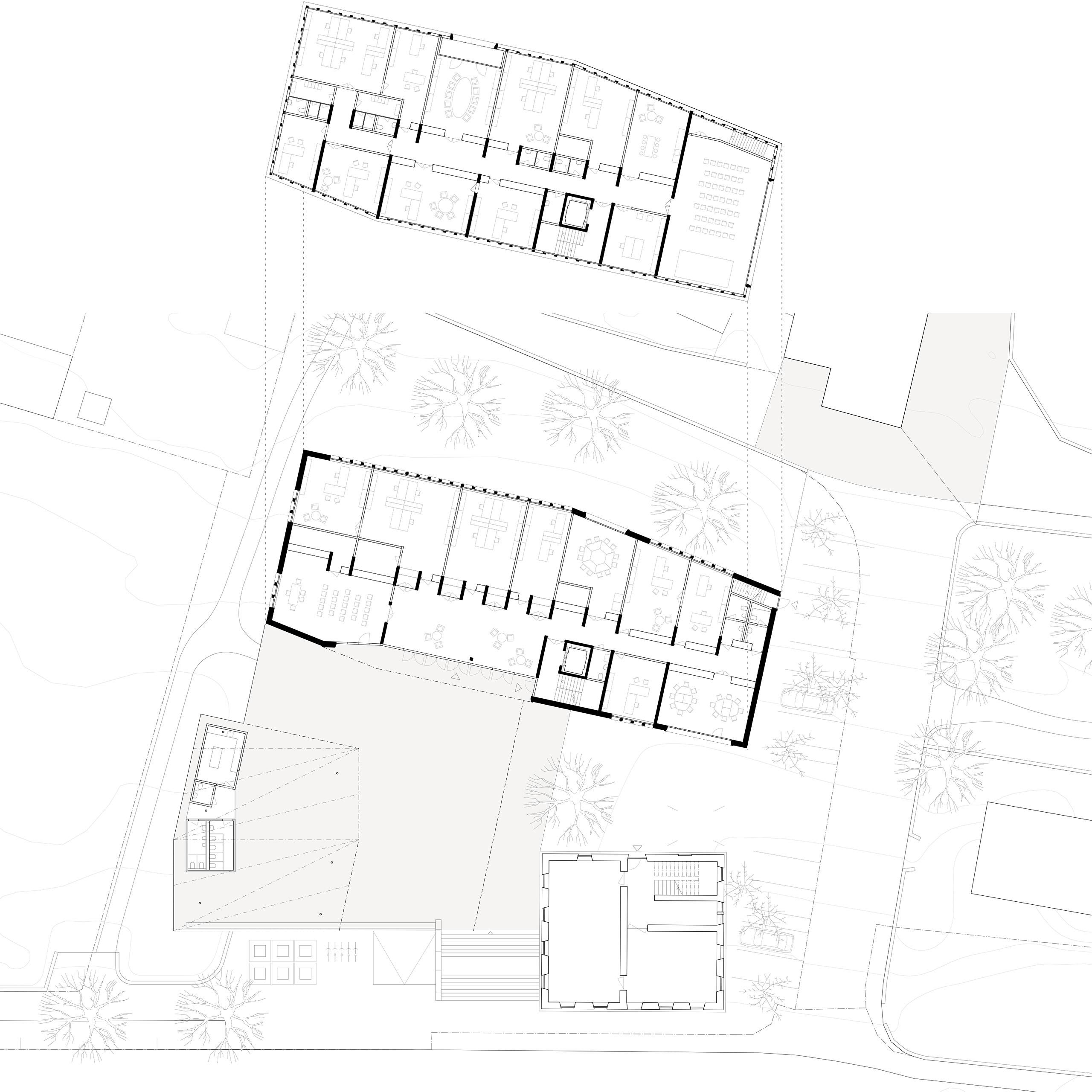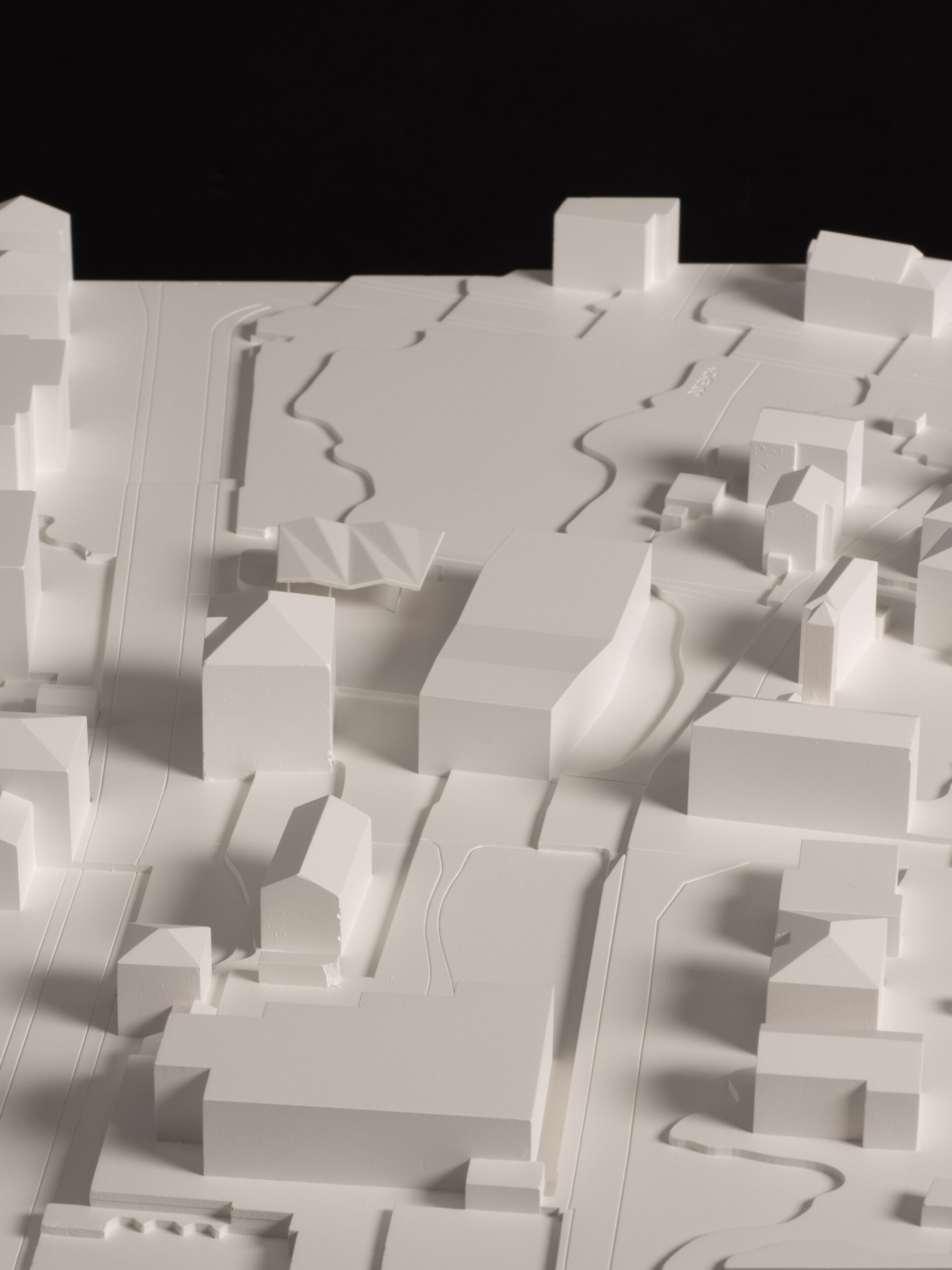 Verso il terreno non ancora definito a sud, un blocco con servizi conclude il generoso spazio aperto, tuttavia protetto da pioggia e sole. Con i pilastri inclinati quasi invisibili, il tetto sembra una scultura volante.