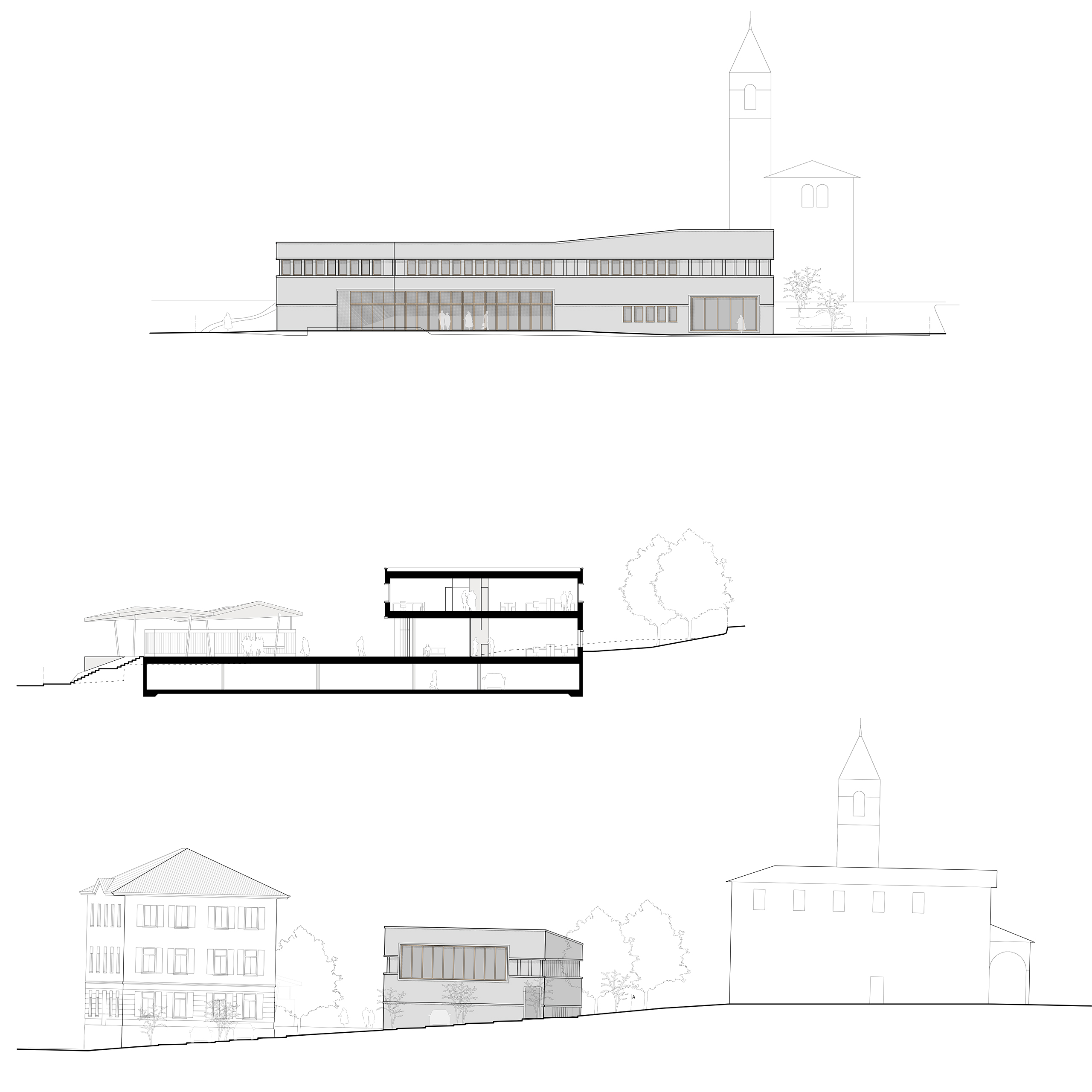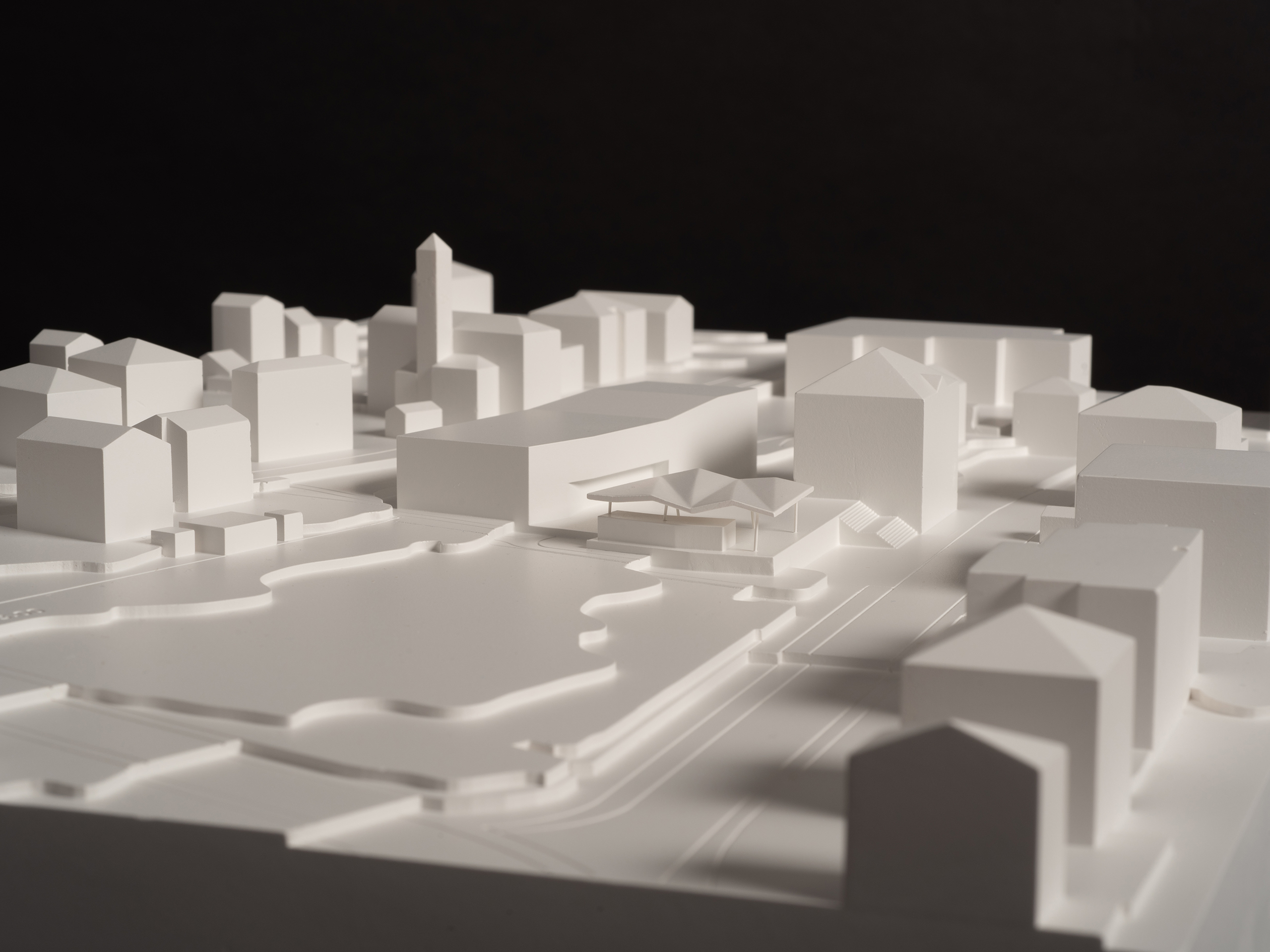 La Nuova Casa Comunale e lo spazio esterno coperto formano, insieme all’edificio storico della Casa Comunale, una piazza generosa pubblica che si lega direttamente alla Via Municipio — un asse stradale d’importanza.