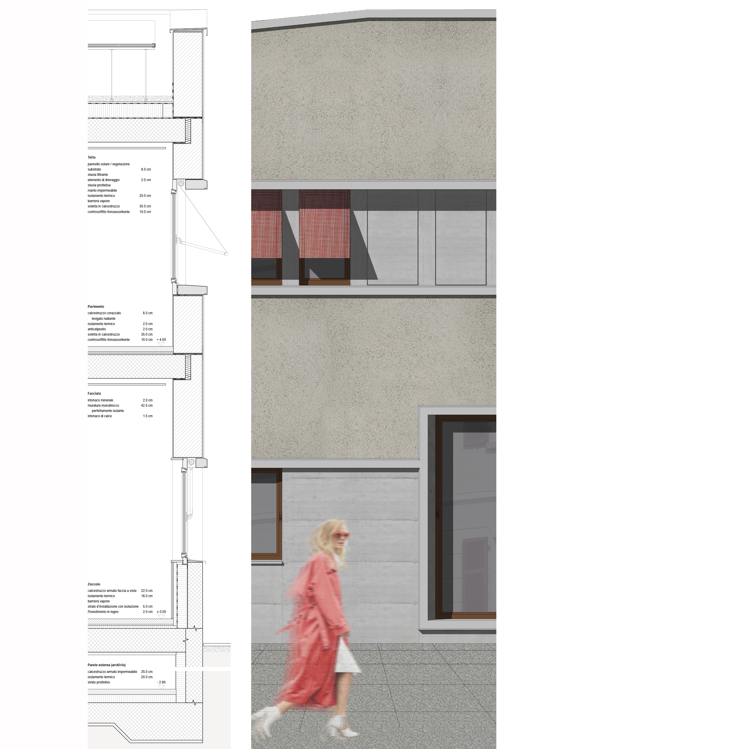 Lo zoccolo in calcestruzzo armato faccia a vista con isolamento interno, garantisce durabilità dove il pubblico, veicoli e acqua potrebbero generare danni.