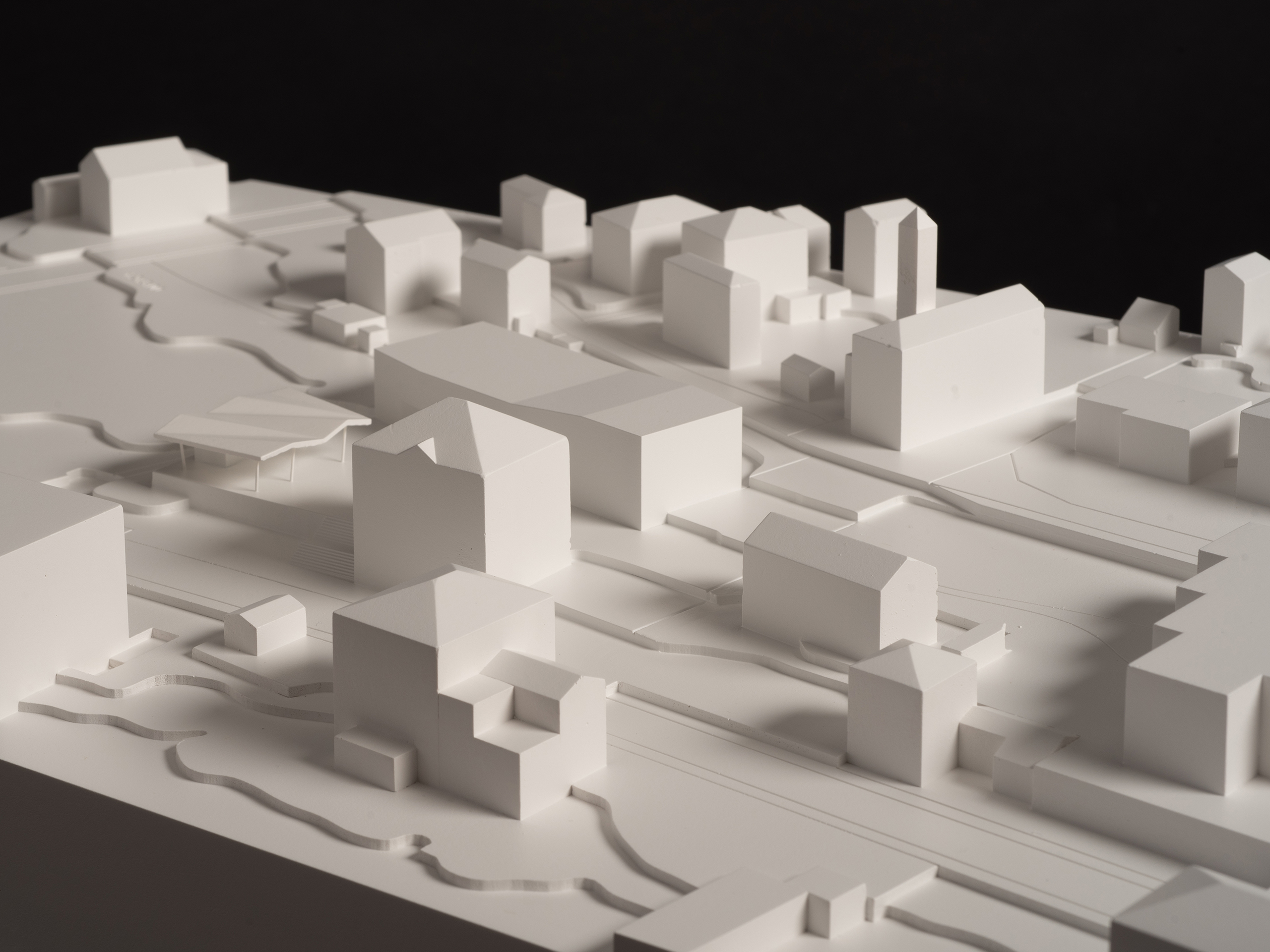 Il volume semplice e compatto della Nuova Casa Comunale comunica con le diverse geometrie dei mappali. La facciata che avvolge l’edificio si suddivide in una parte bassa interpretata come una base solida, una parte intermedia arricchita da un nastro di finestre e una parte finale di copertura. Il bordo del tetto – come le facciate longitudinali – non è completamente dritto, ma forma un angolo ascendente per mostrare la presenza della Sala del Consiglio comunale. Anche le altre sale riunioni sono visibili nelle facciate, interrompendo la rete continua delle finestre degli uffici. L’incisione nel volume verso la Piazza segnala l’ingresso.